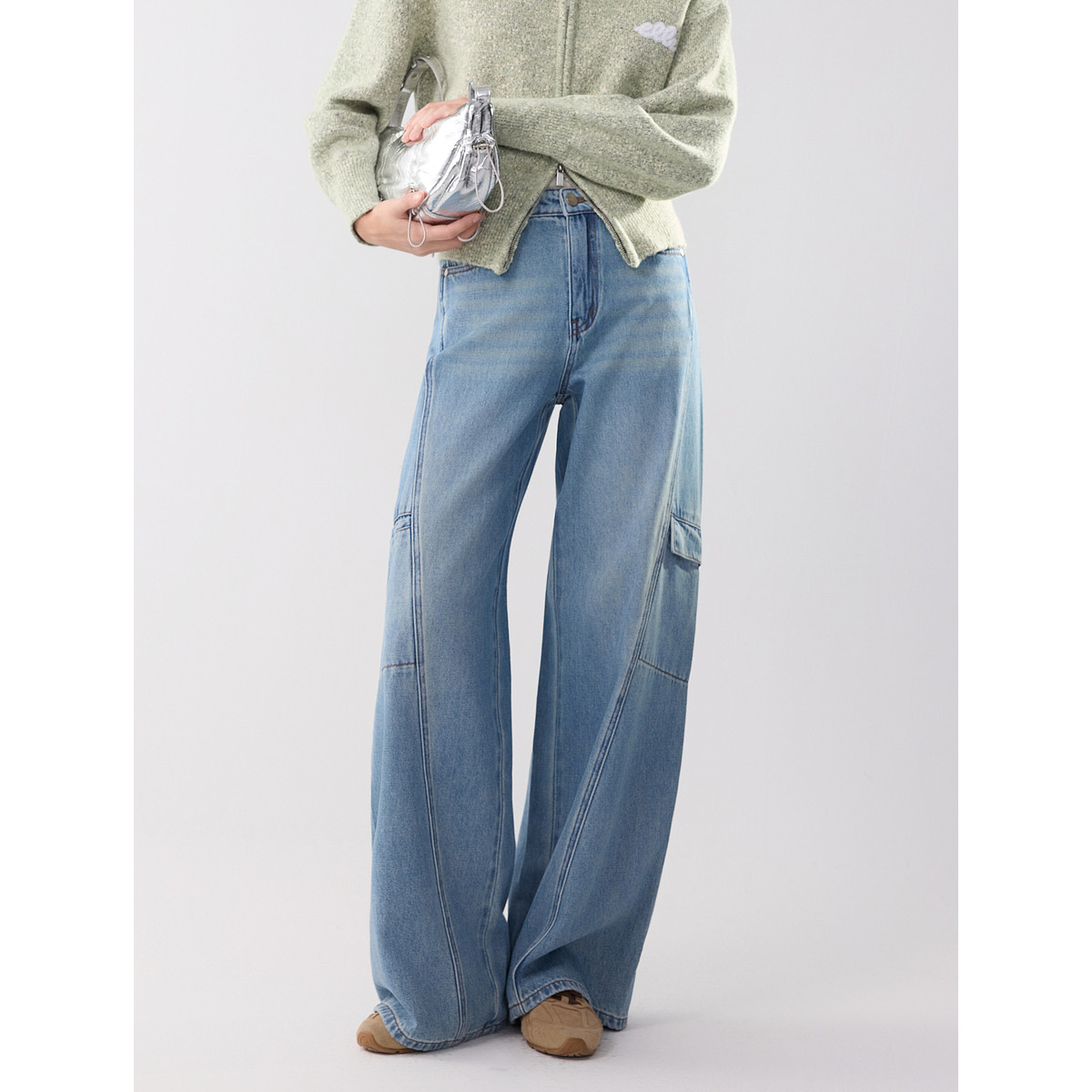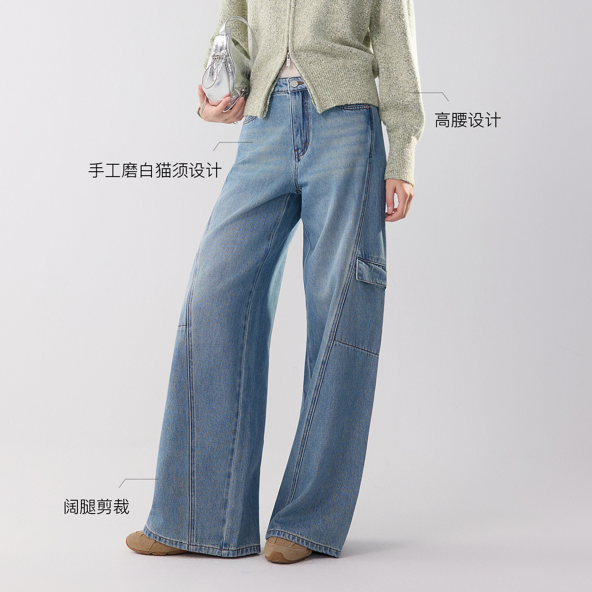 ELLE法式复古工装牛仔裤女2025冬季新款设计感宽松显瘦阔腿裤子
