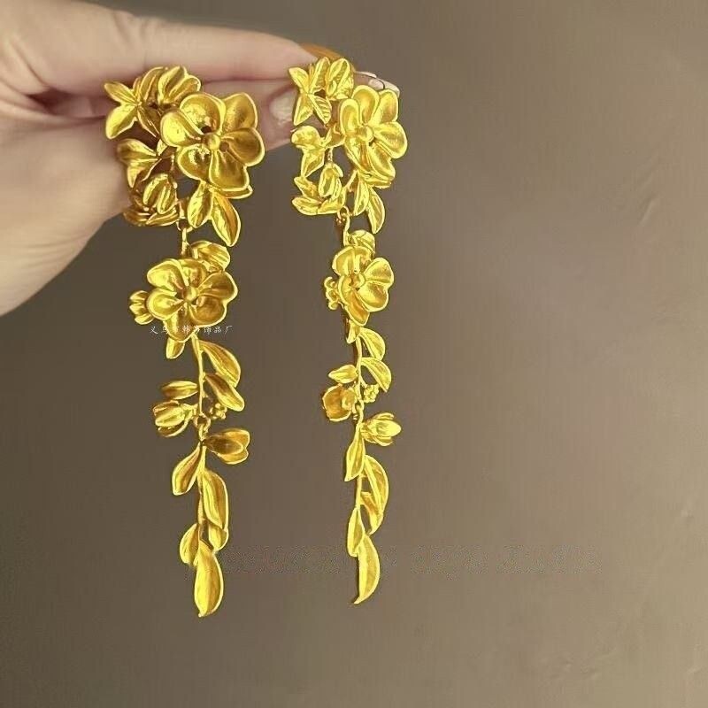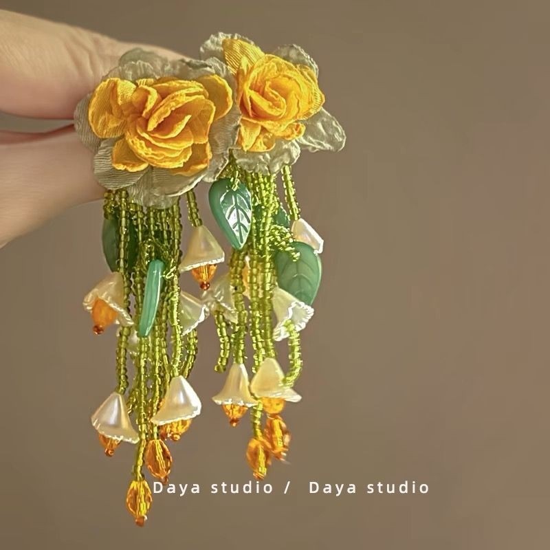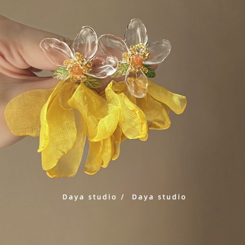 花落黄昏~度假风超仙黄色雪纺花朵耳环个性夸张耳饰耳钉耳坠饰品