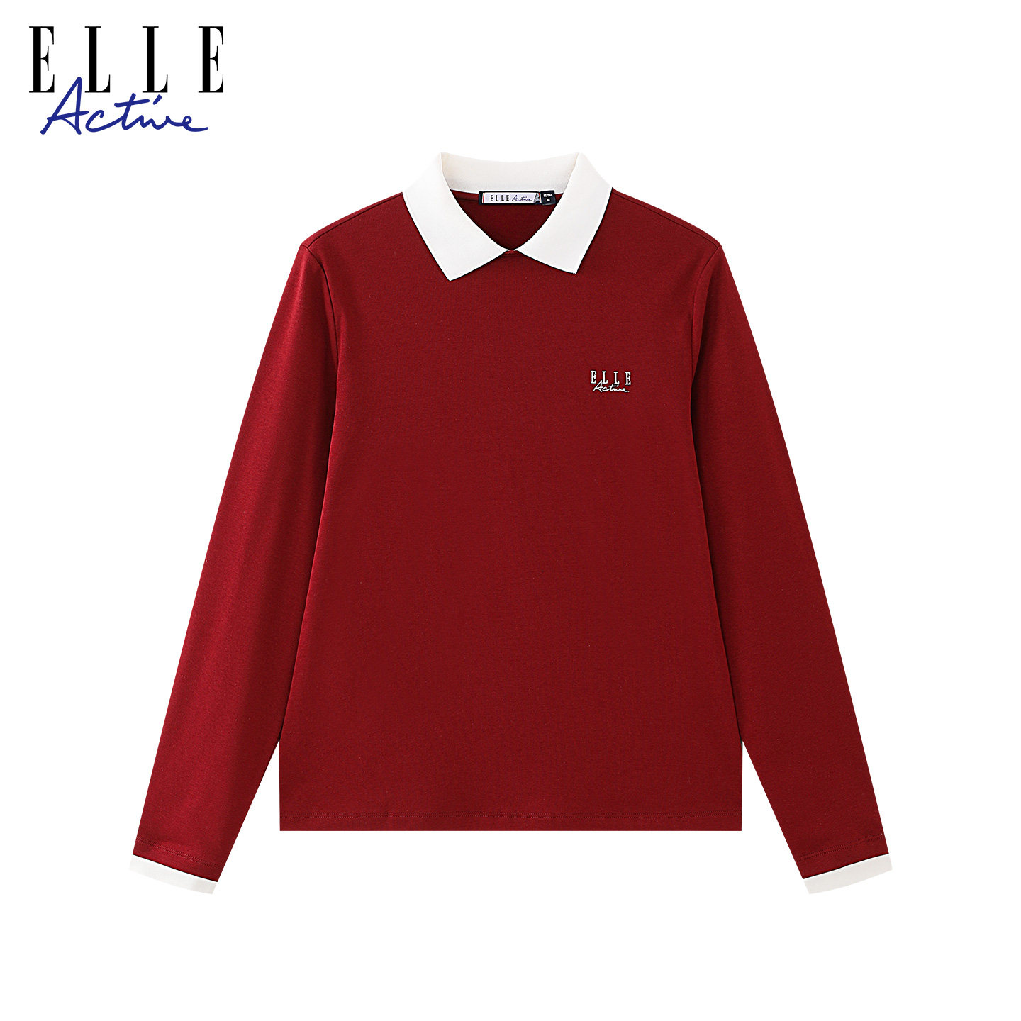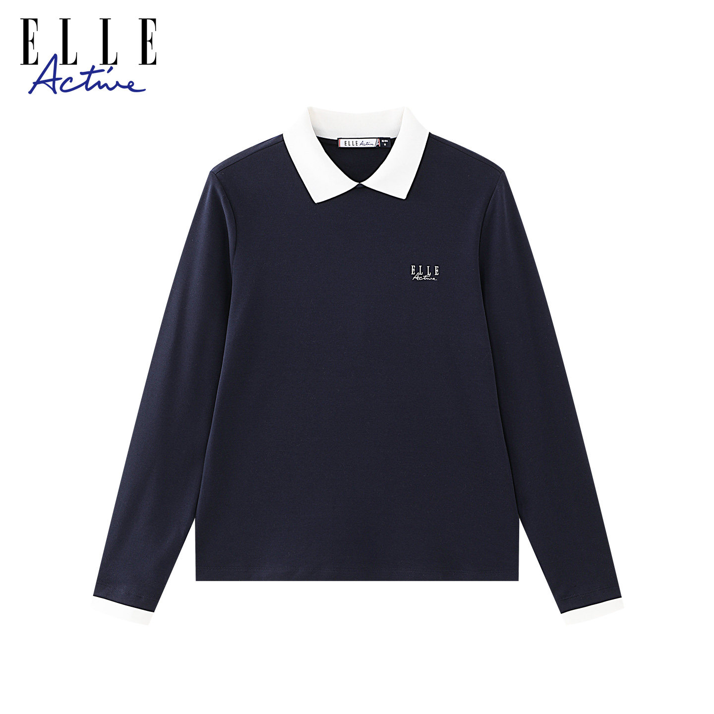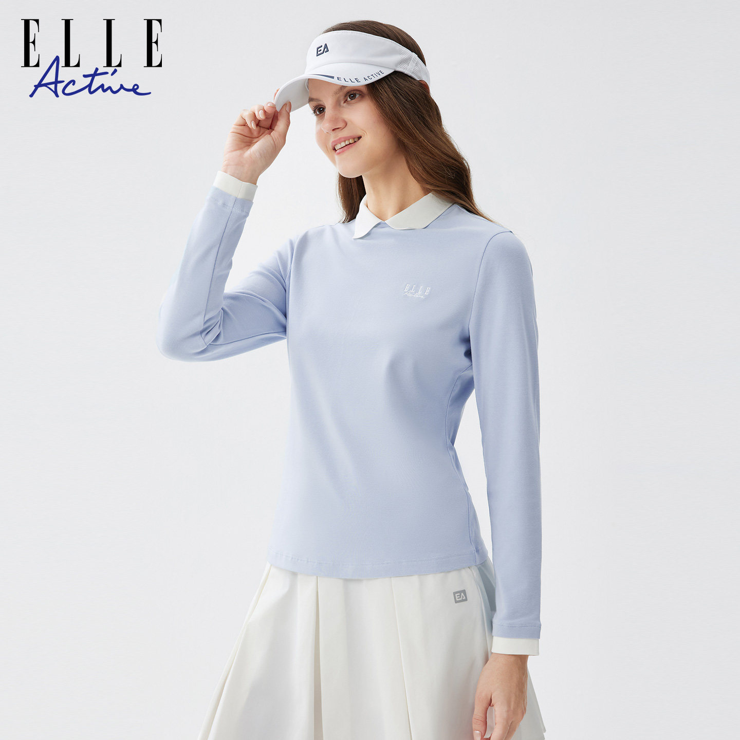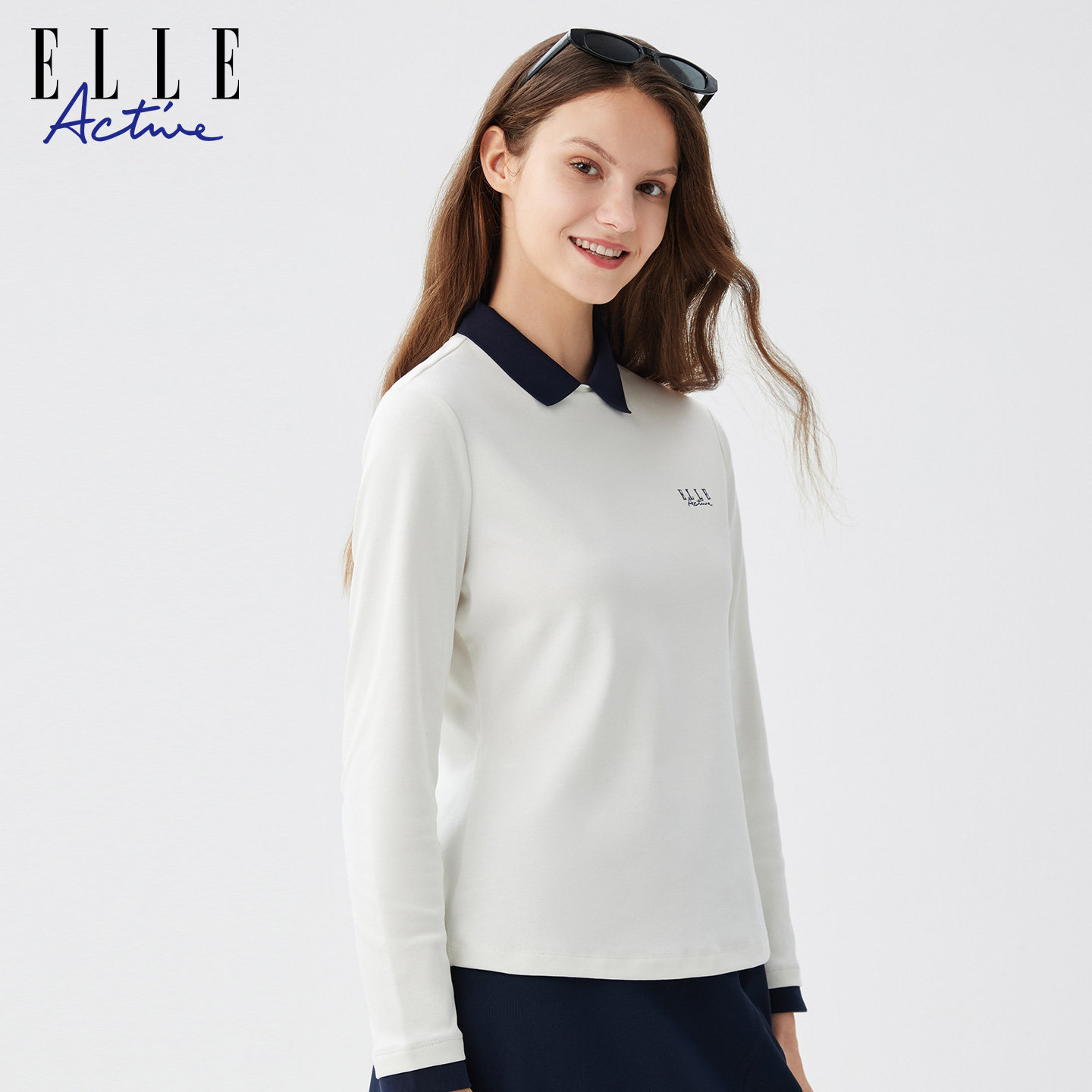 ELLE Active高智穿搭户外休闲米白色长袖t恤女高尔夫运动翻领上衣