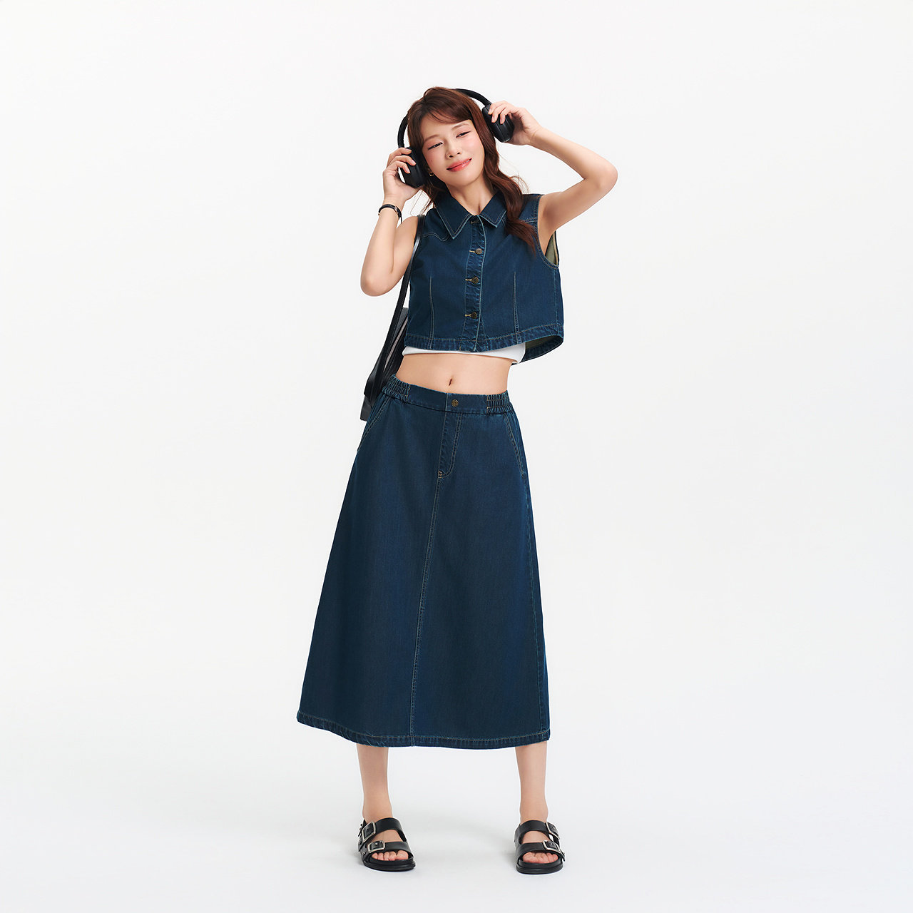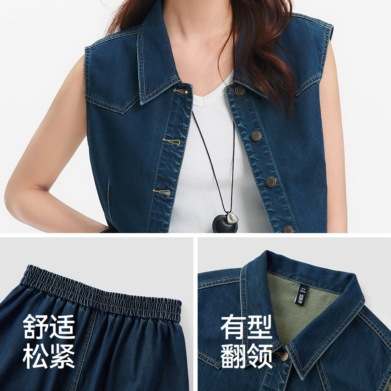 森柔|森马牛仔套装女夏松紧腰伞裙翻领短马甲潮流港风街头两件套