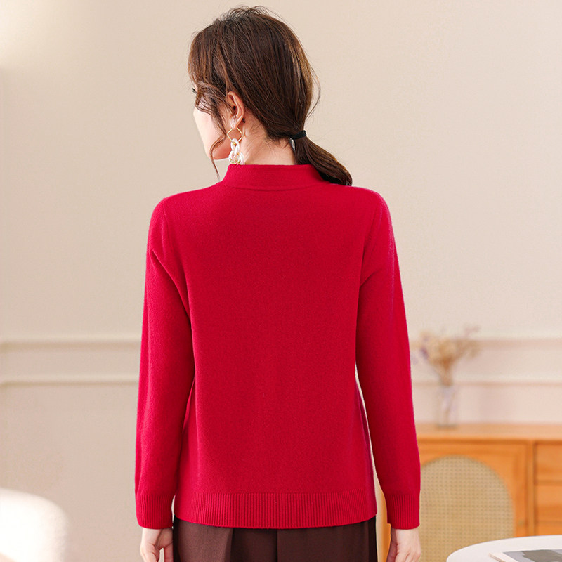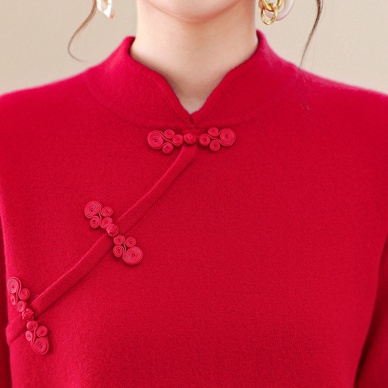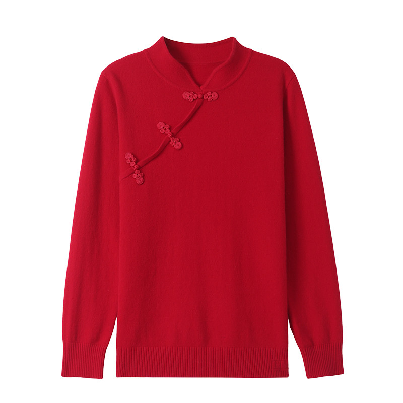 恒源祥新中式100%羊毛衫国风斜襟扣女秋冬新款妈妈立领针织打底衫