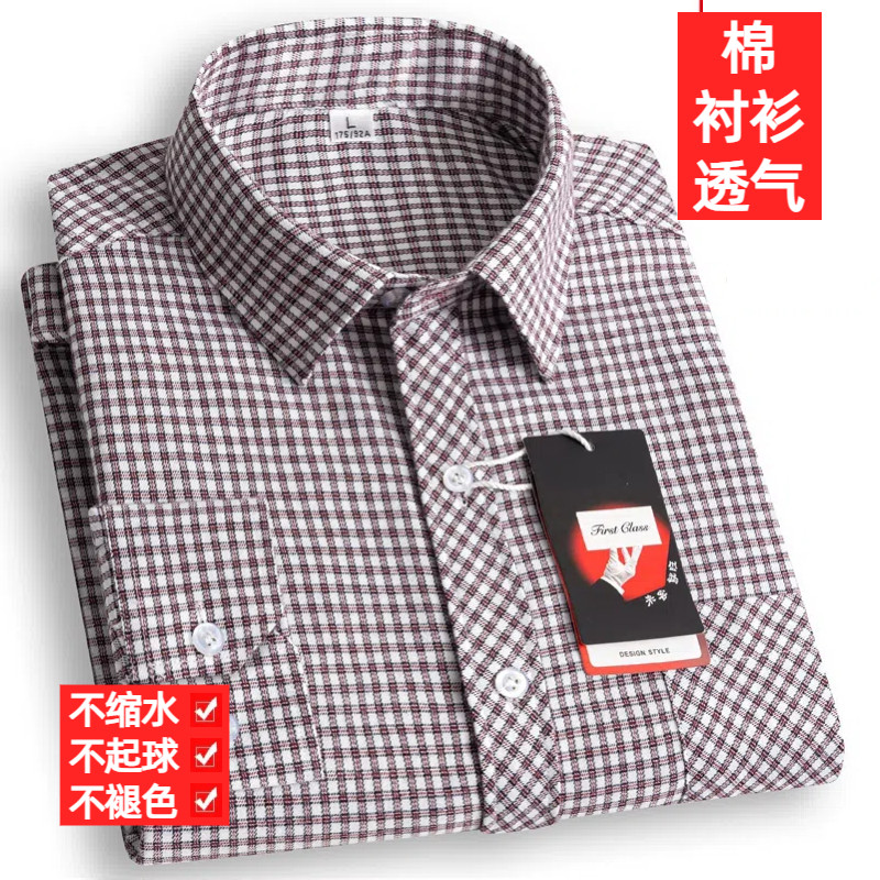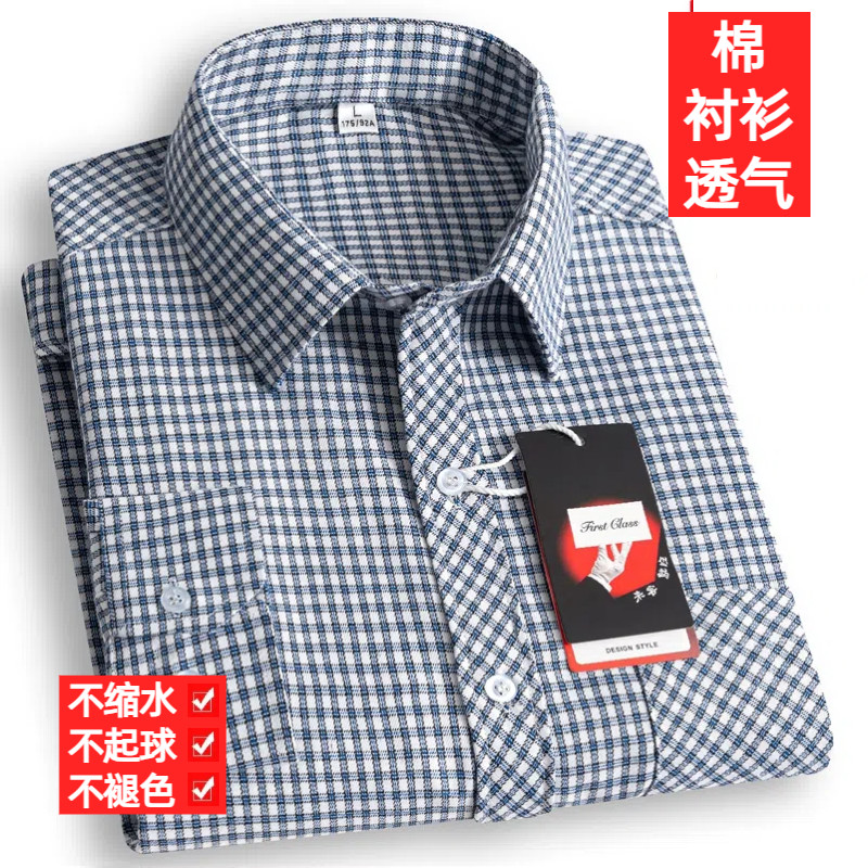 纯棉100%格子衬衫男长袖休闲风透气免烫抗皱宽松衬衣有口袋爸爸装