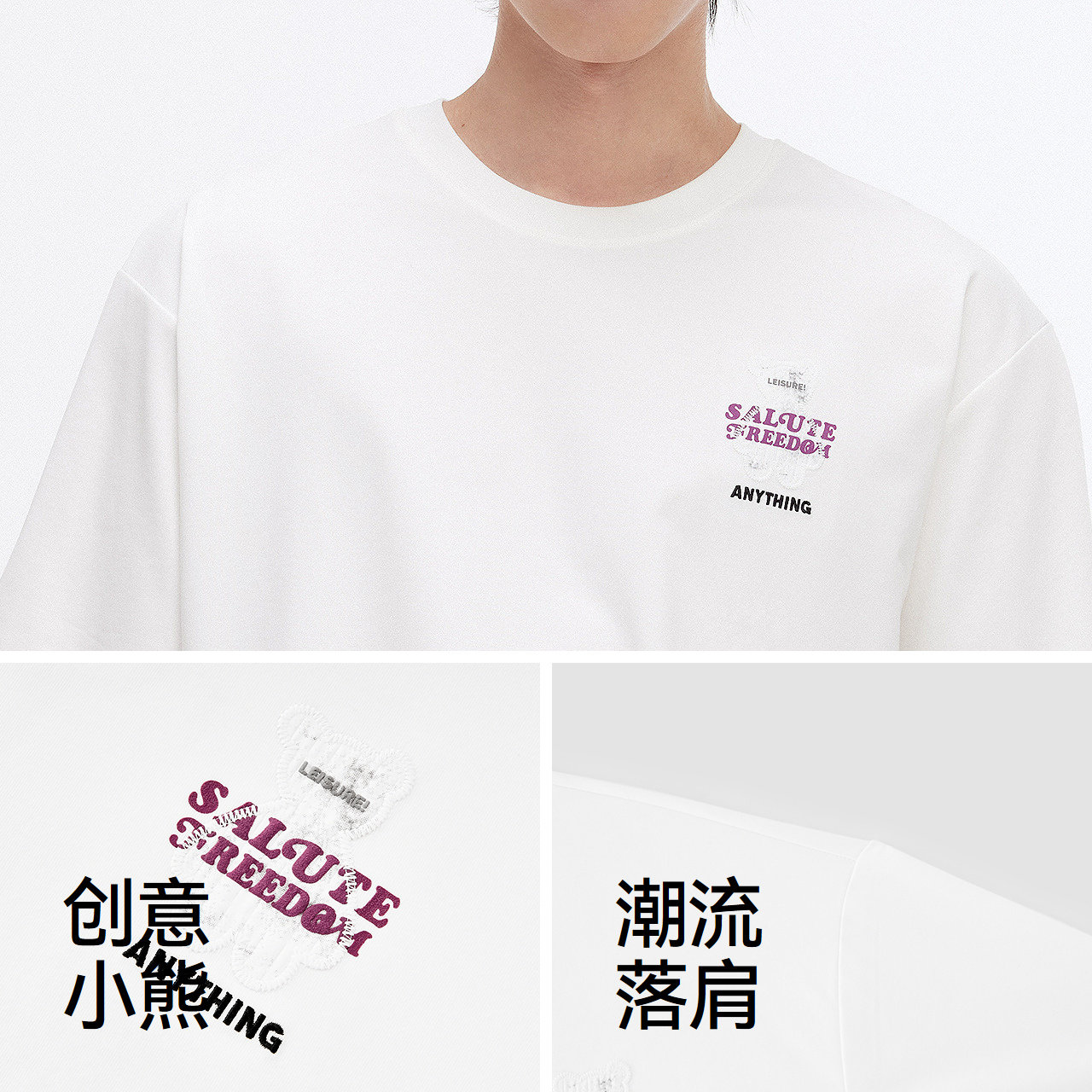 宽松创意小熊短袖T恤 撞色字母绣花