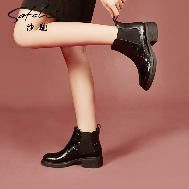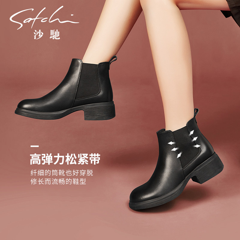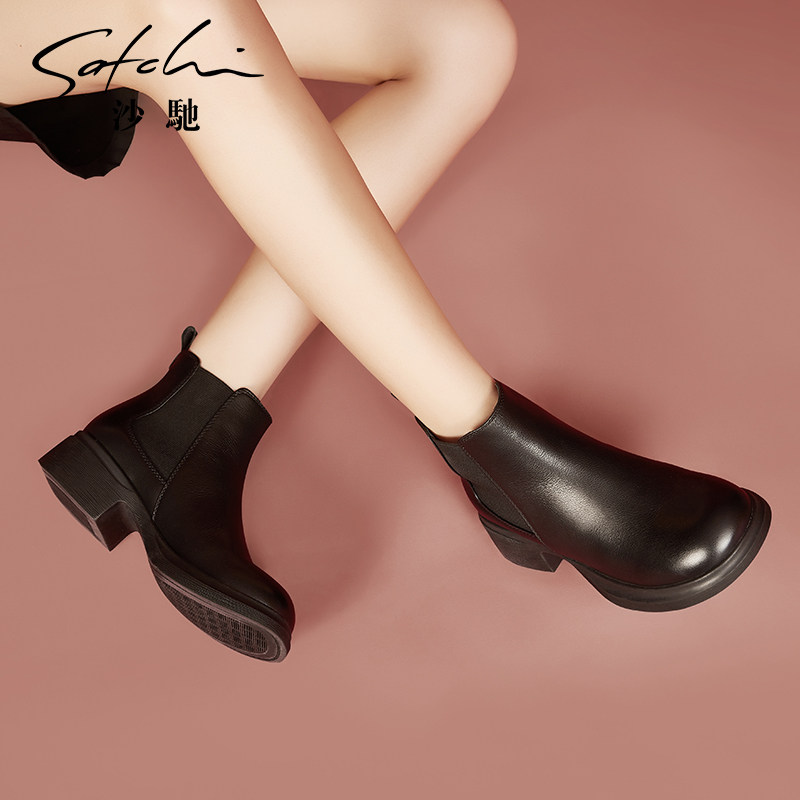 沙驰真皮切尔西靴女秋冬新款黑色粗跟中跟圆头短靴大头靴子裸靴子