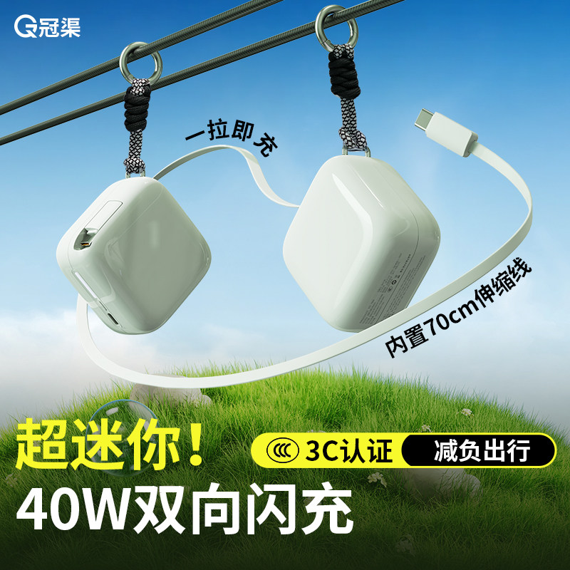 新国标3C认证40W快充充电宝自带伸缩线长线迷你挂包可上飞机便携式户外挂钩抽拉移动电源一万毫安适用苹果17