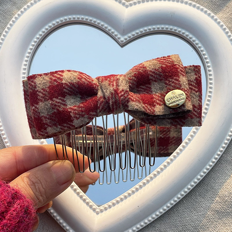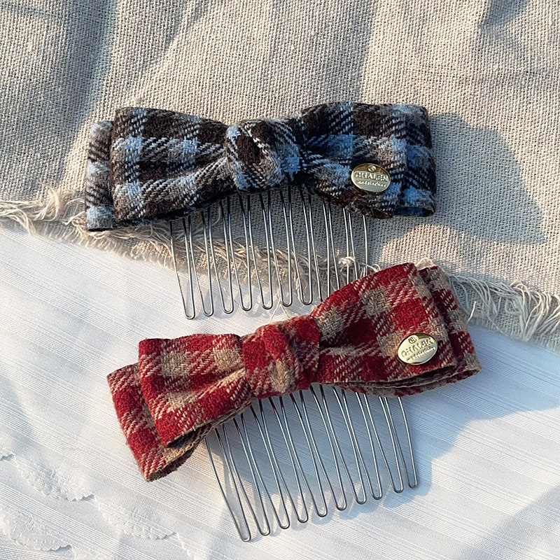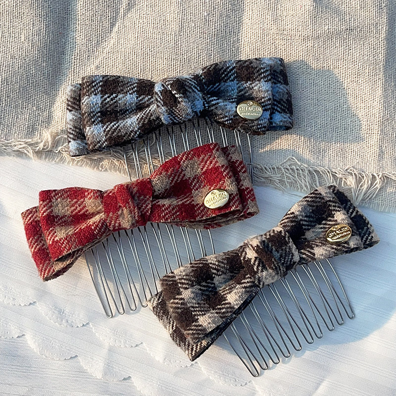 小金标复古格子学院风发梳女高级感新款碎发梳蝴蝶结后脑勺倒插梳