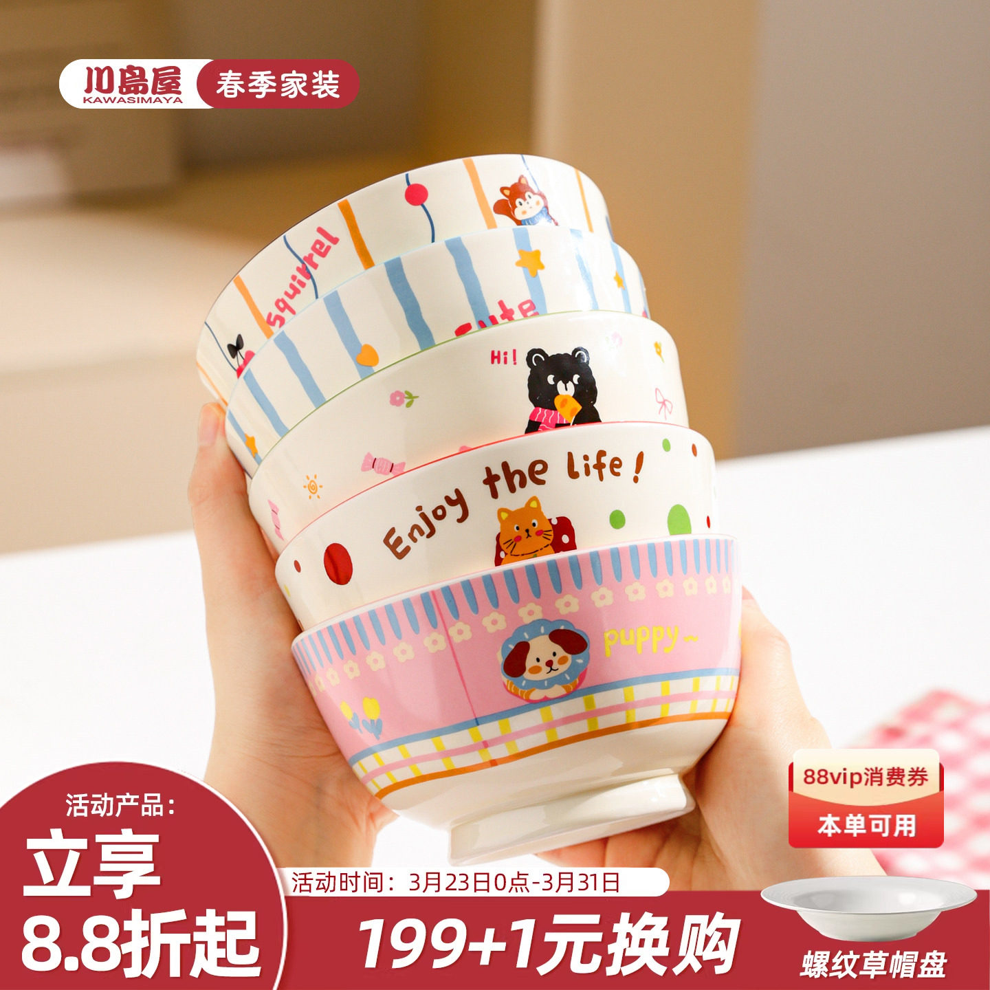 奶油风陶瓷碗家用卡通菜盘子可爱米饭碗汤碗釉下彩儿童餐具耐高温