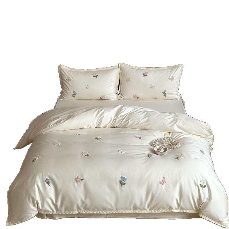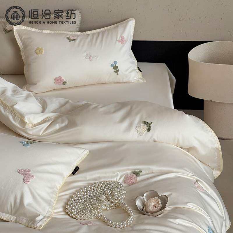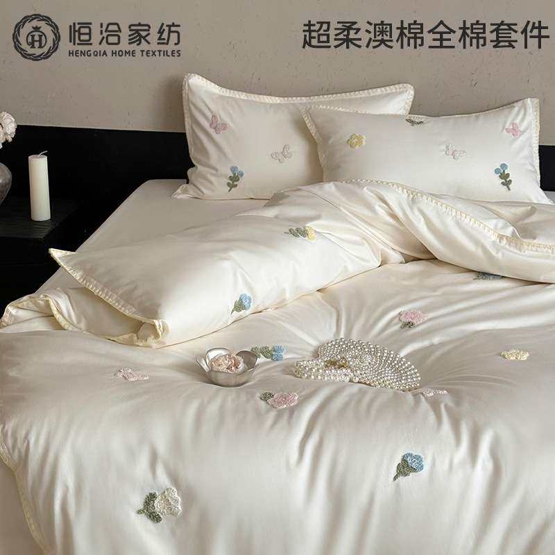 少女心高支澳棉纯棉四件套清新花卉毛巾绣贝壳边全棉被套床品粉色