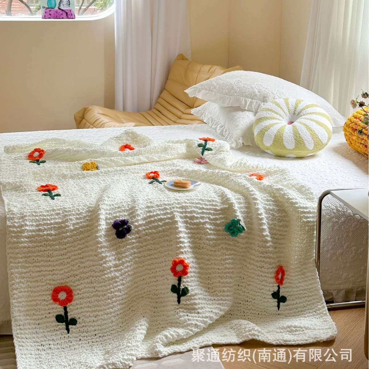 纯手工重工棒针线毯粗毛线毯子民宿风立体花朵盖毯冰条绒毛毯