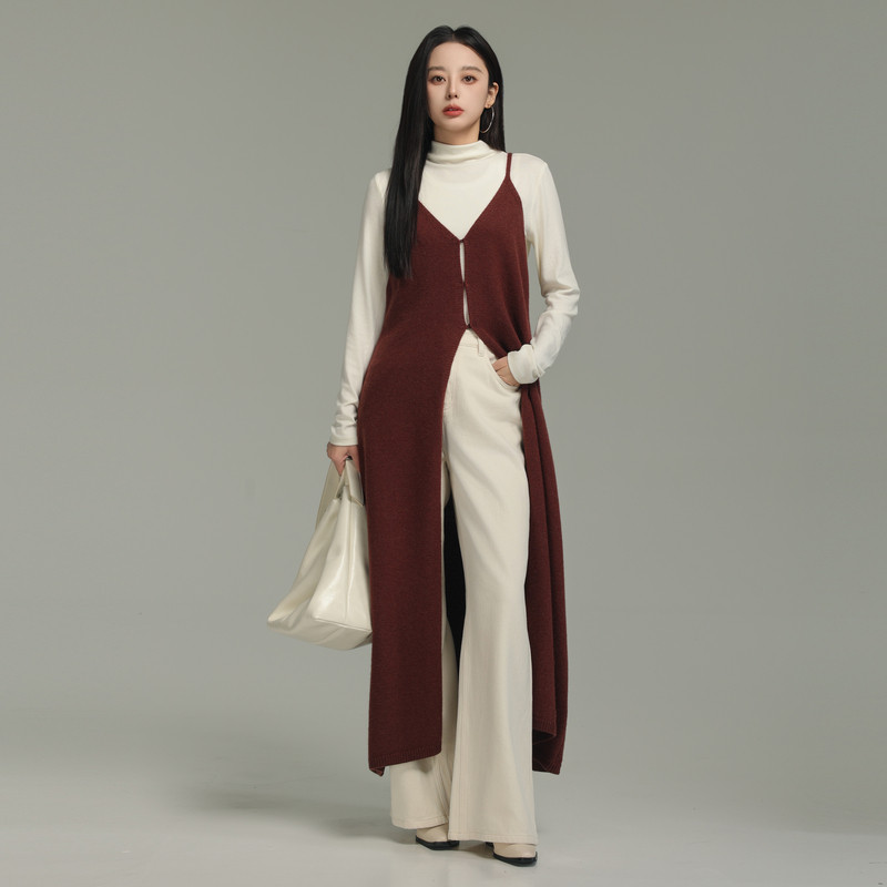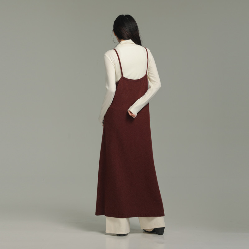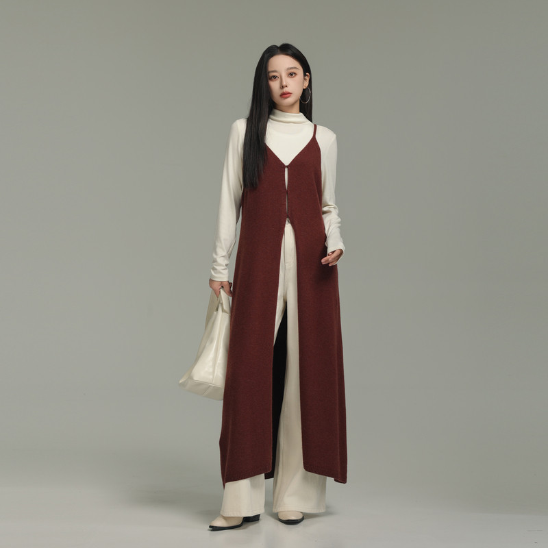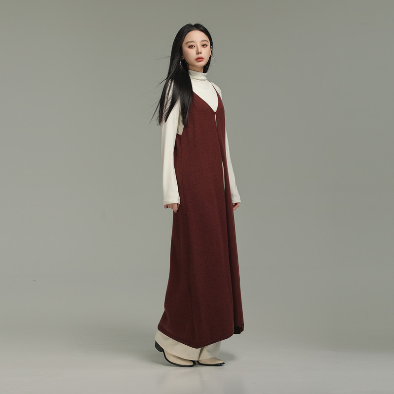 AIRIQI冬季新款极简风全开襟宽松V领针织吊带罩衫连衣裙AX44LQ288
