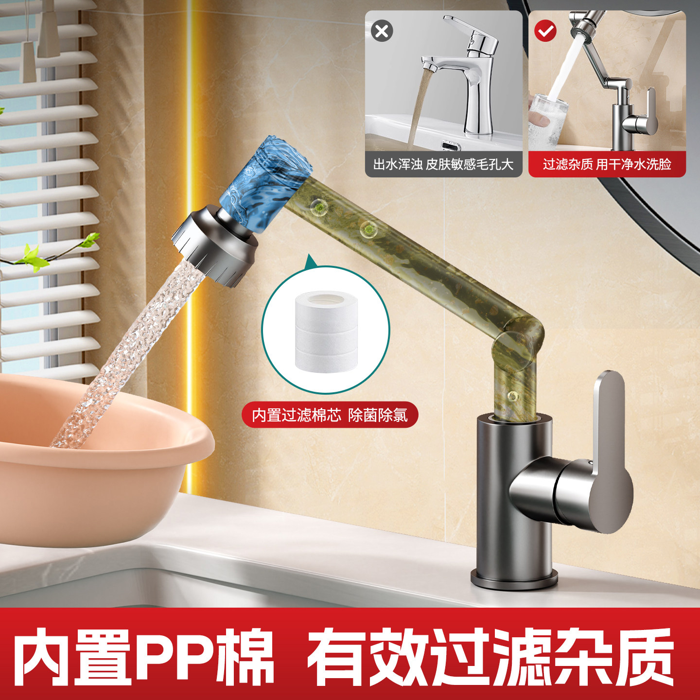 洗脸盆水龙头机械臂万向旋转招财猫卫生间洗漱洗手池面盆加长加高