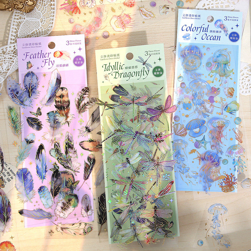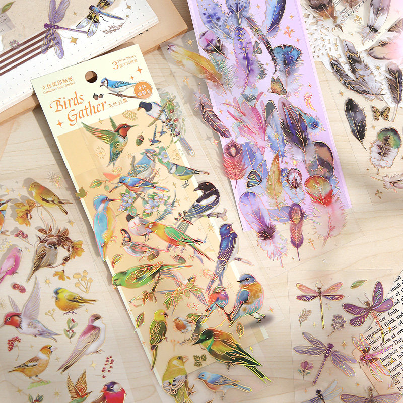 PET立体烫金水母小鸟可爱咕卡贴纸彩色羽毛蜻蜓手帐diy装饰素材贴