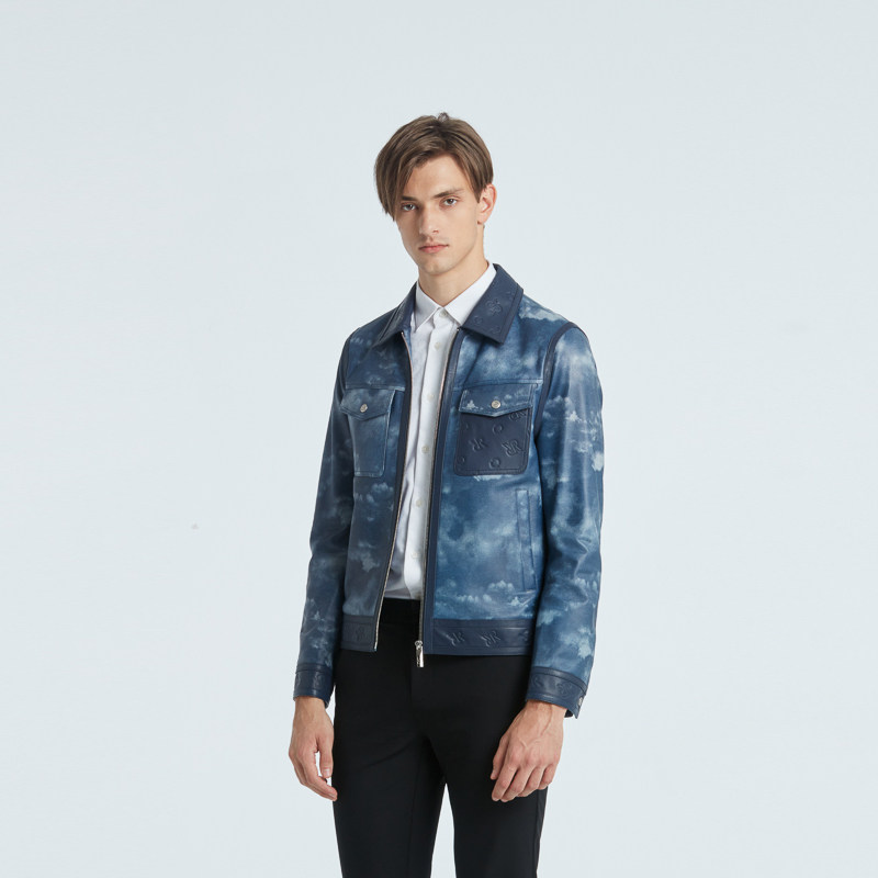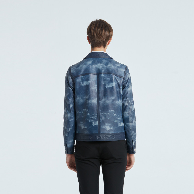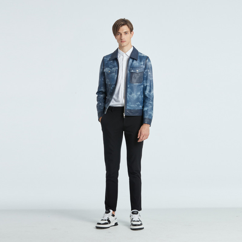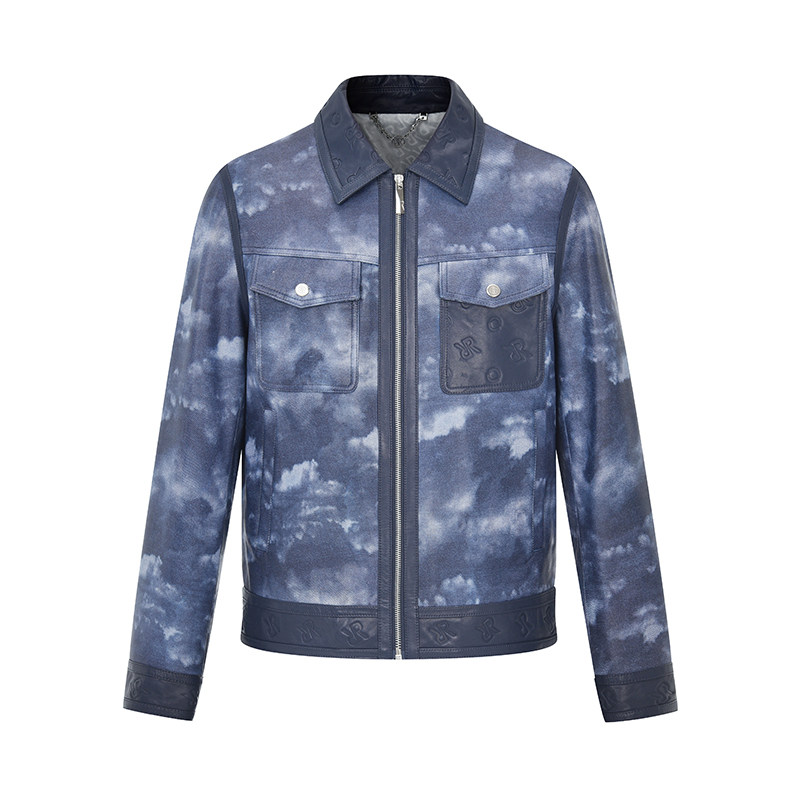 RARE威雅男装秋冬新款修身深蓝色印花翻领夹克外套男士皮衣
