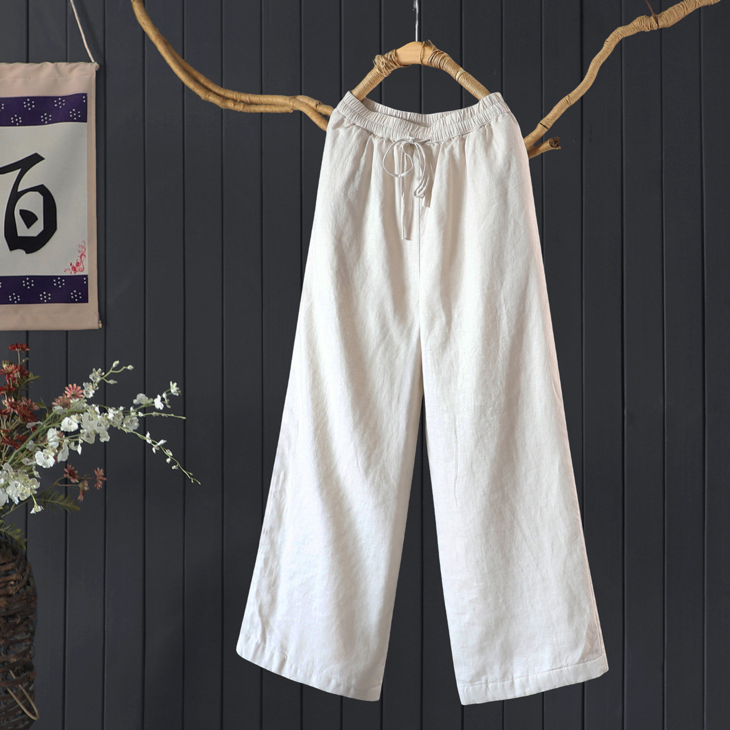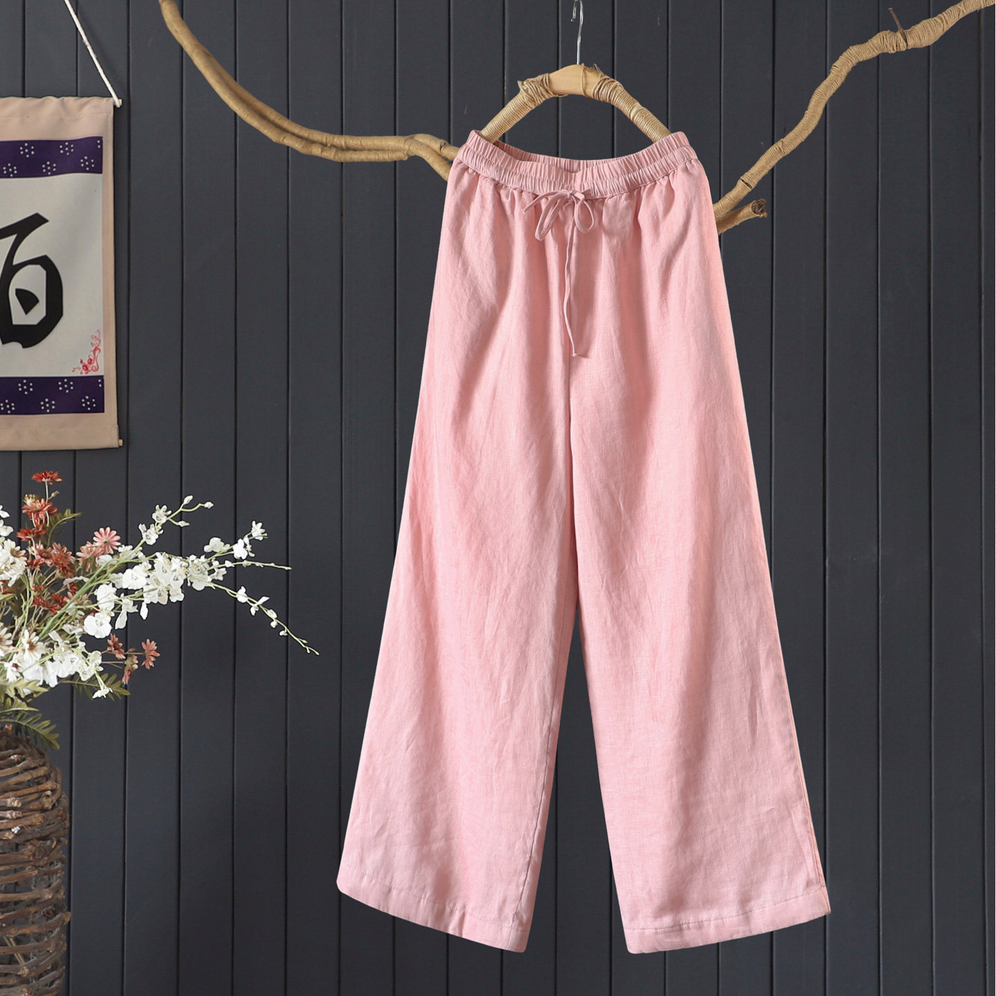 冬季文艺宽松显瘦纯色亚麻夹棉加厚加长长裤女直筒保暖棉裤阔腿裤