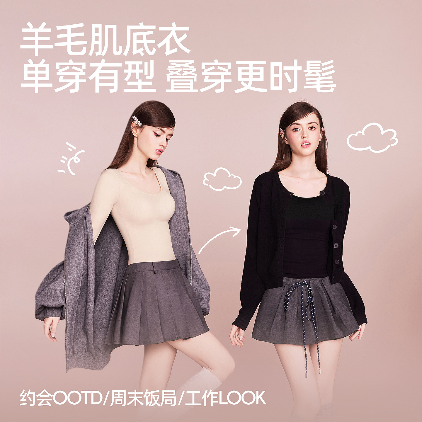 好奇蜜斯羊毛保暖内衣女发热抗静电肌底衣秋冬内搭带胸垫加绒秋衣