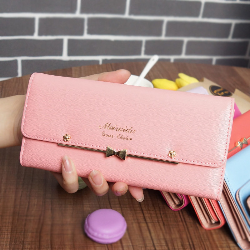 批发2025新款女士钱包韩版搭扣可爱女学生钱包蝴蝶结长款铆钉钱夹