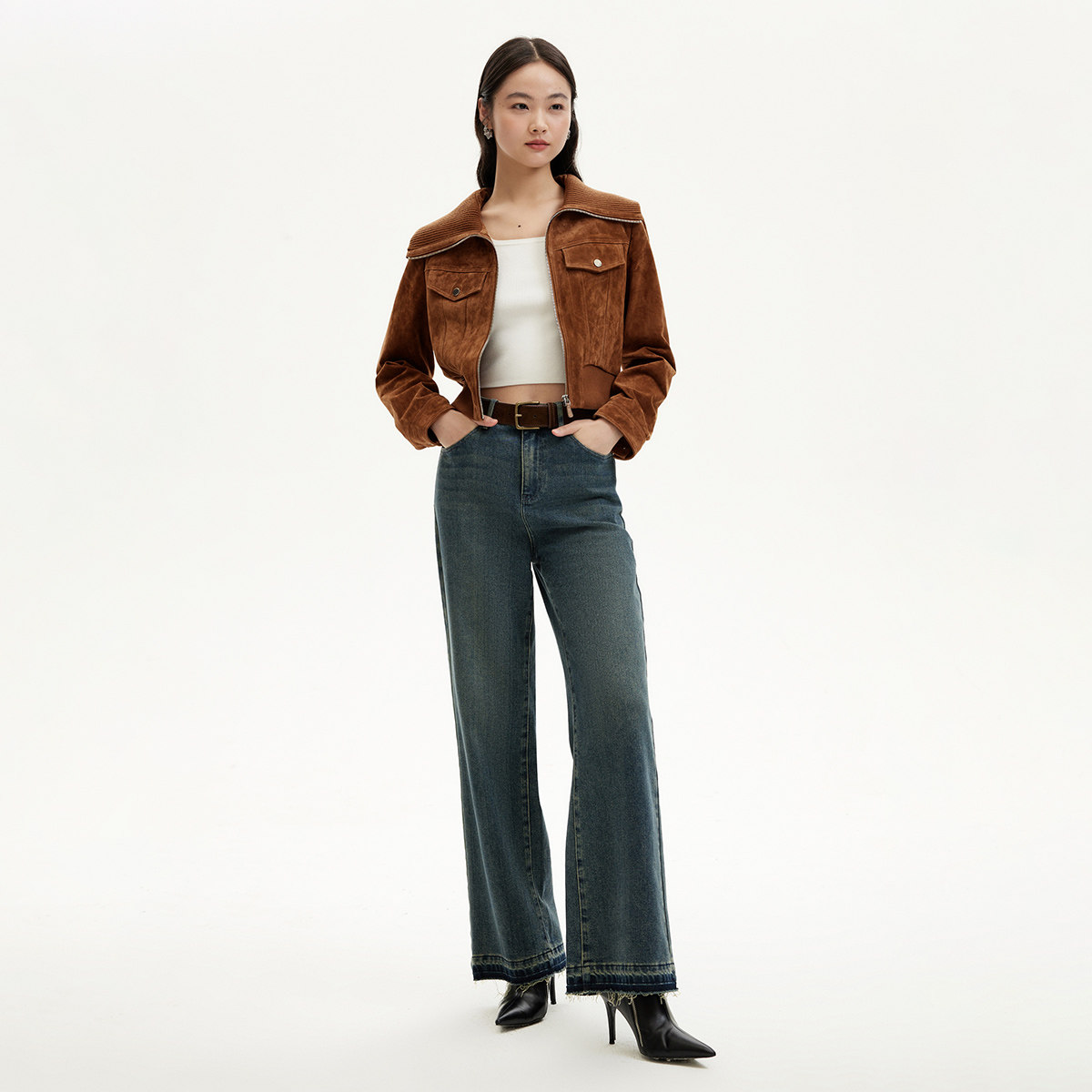 Eland衣恋皮衣女纯色带拉链长袖翻领外套2025冬季新款