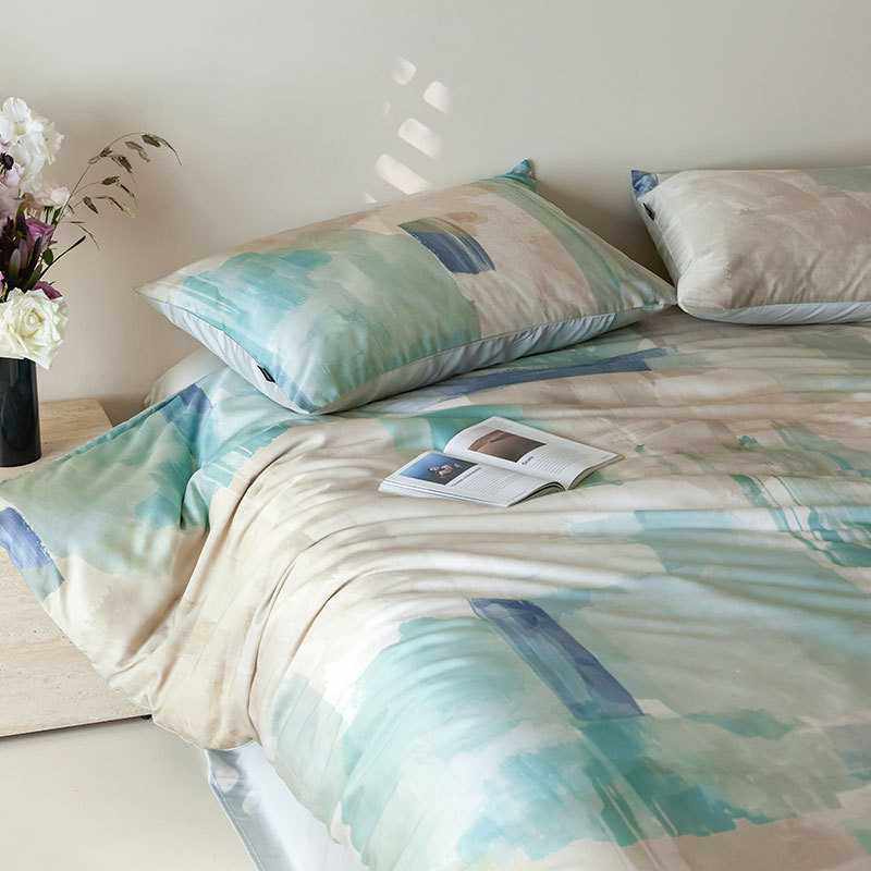 60支A类天丝数码印四件套夏季丝滑蓝粉被套纯色床单透气清凉床品