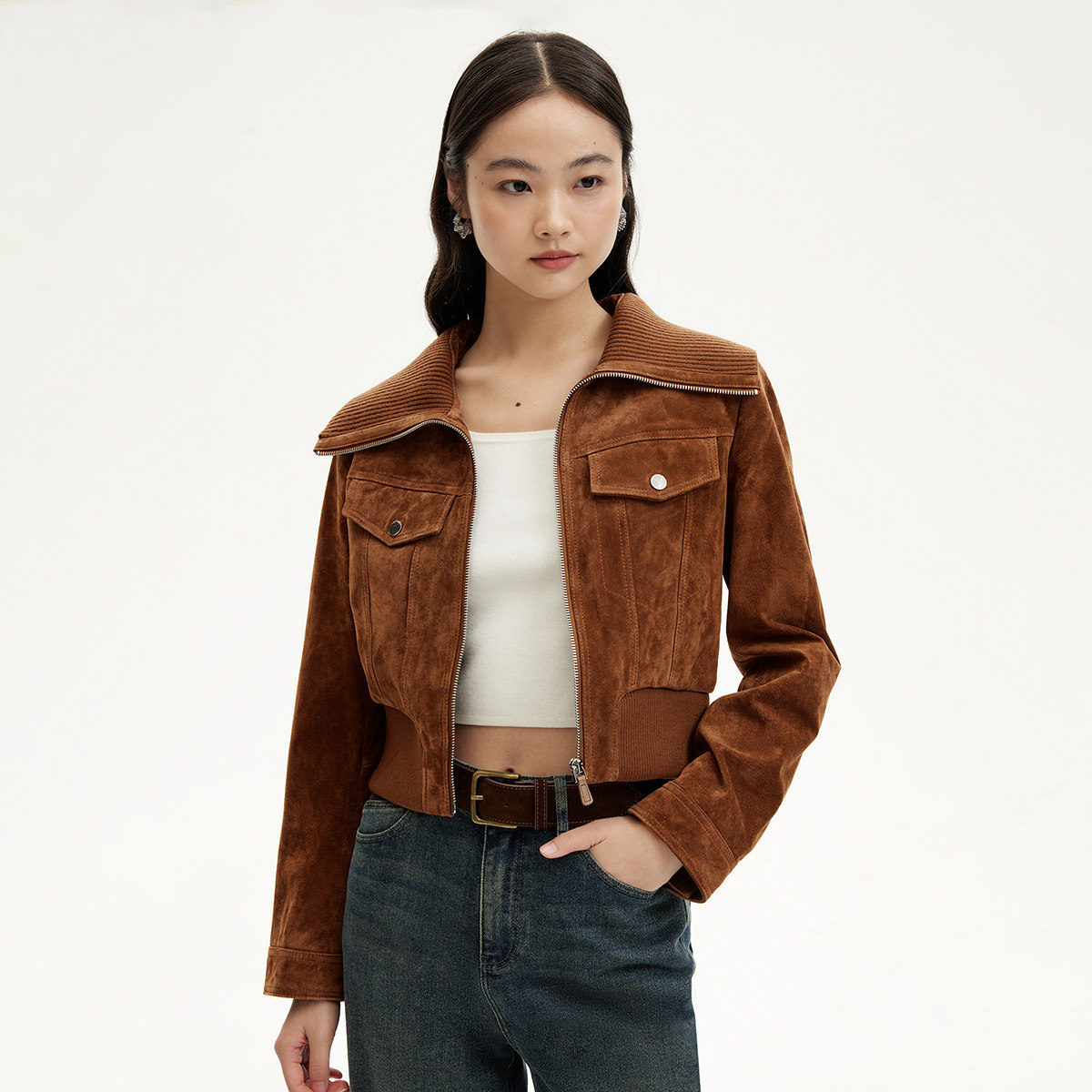 Eland衣恋皮衣女纯色带拉链长袖翻领外套2025冬季新款