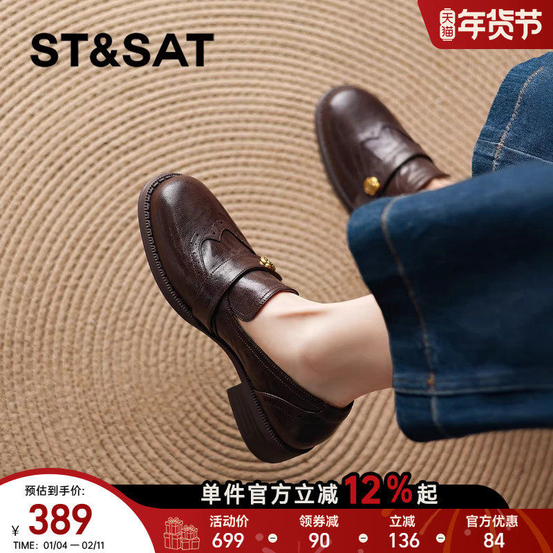 星期六乐福鞋女新款气质百搭浅口单鞋山茶花棕色小皮鞋一脚蹬