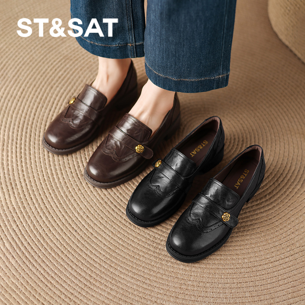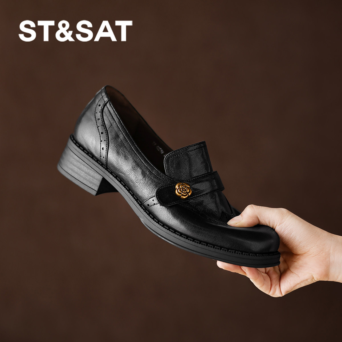 星期六真皮乐福鞋女山茶花新款秋季女鞋平底单鞋英伦风黑色小皮鞋