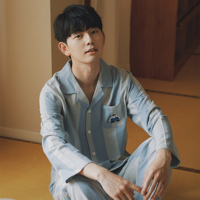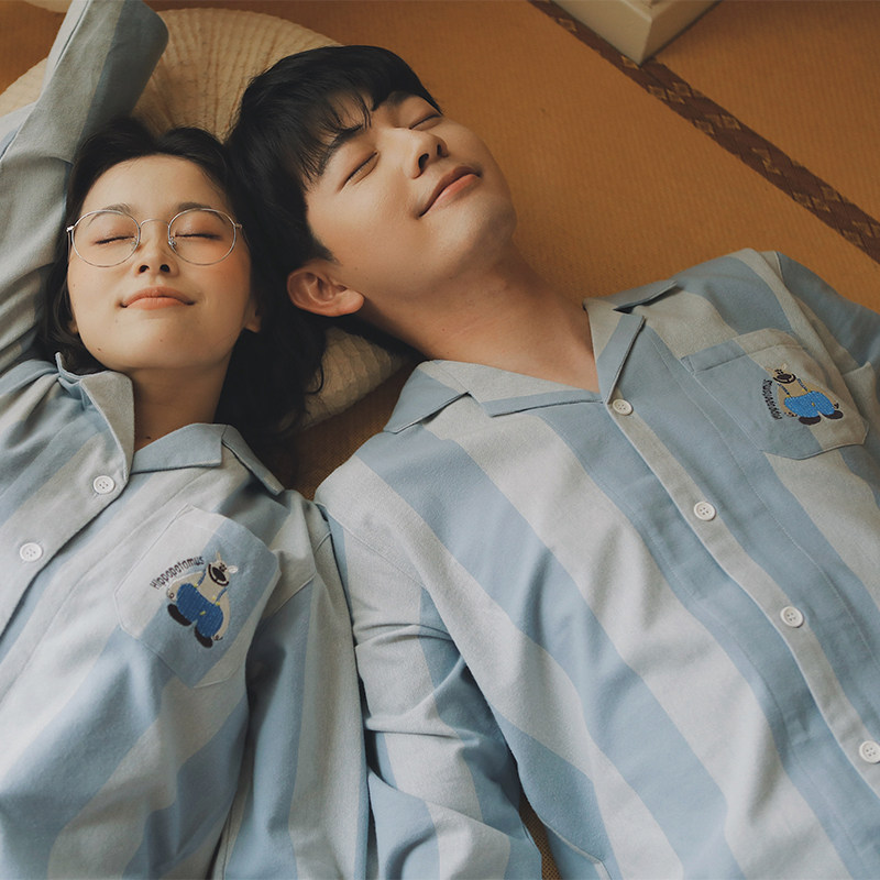 安比斯情侣睡衣舒适纯棉秋季女长袖男女同款休闲家居服套装可出门