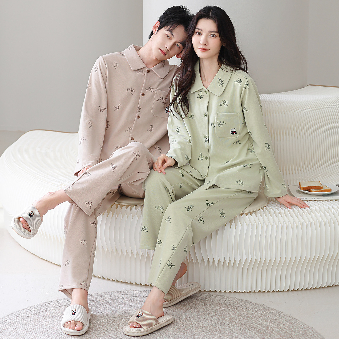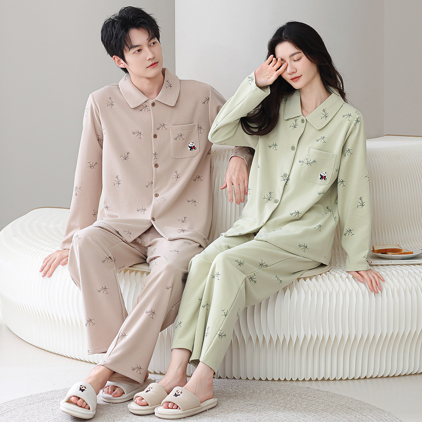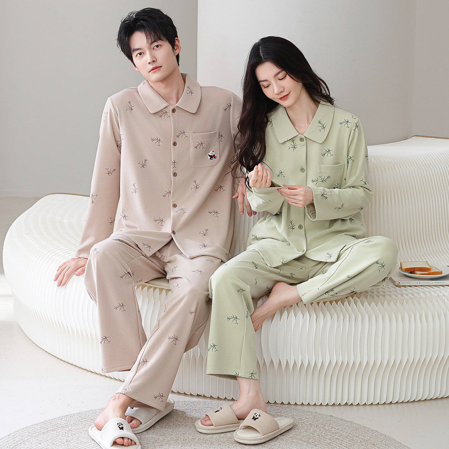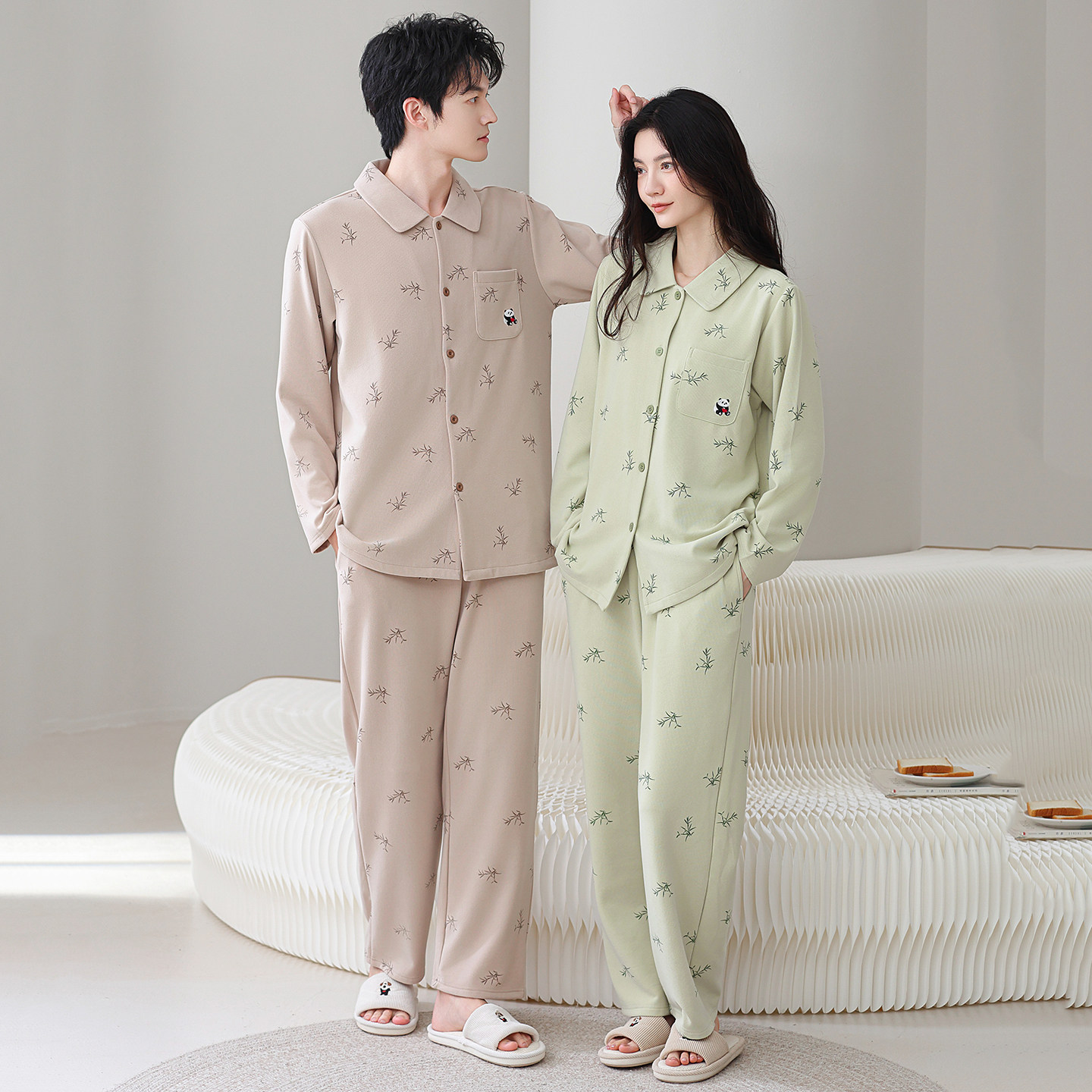 安比斯情侣睡衣舒适纯棉秋季女长袖男女同款休闲家居服套装可出门