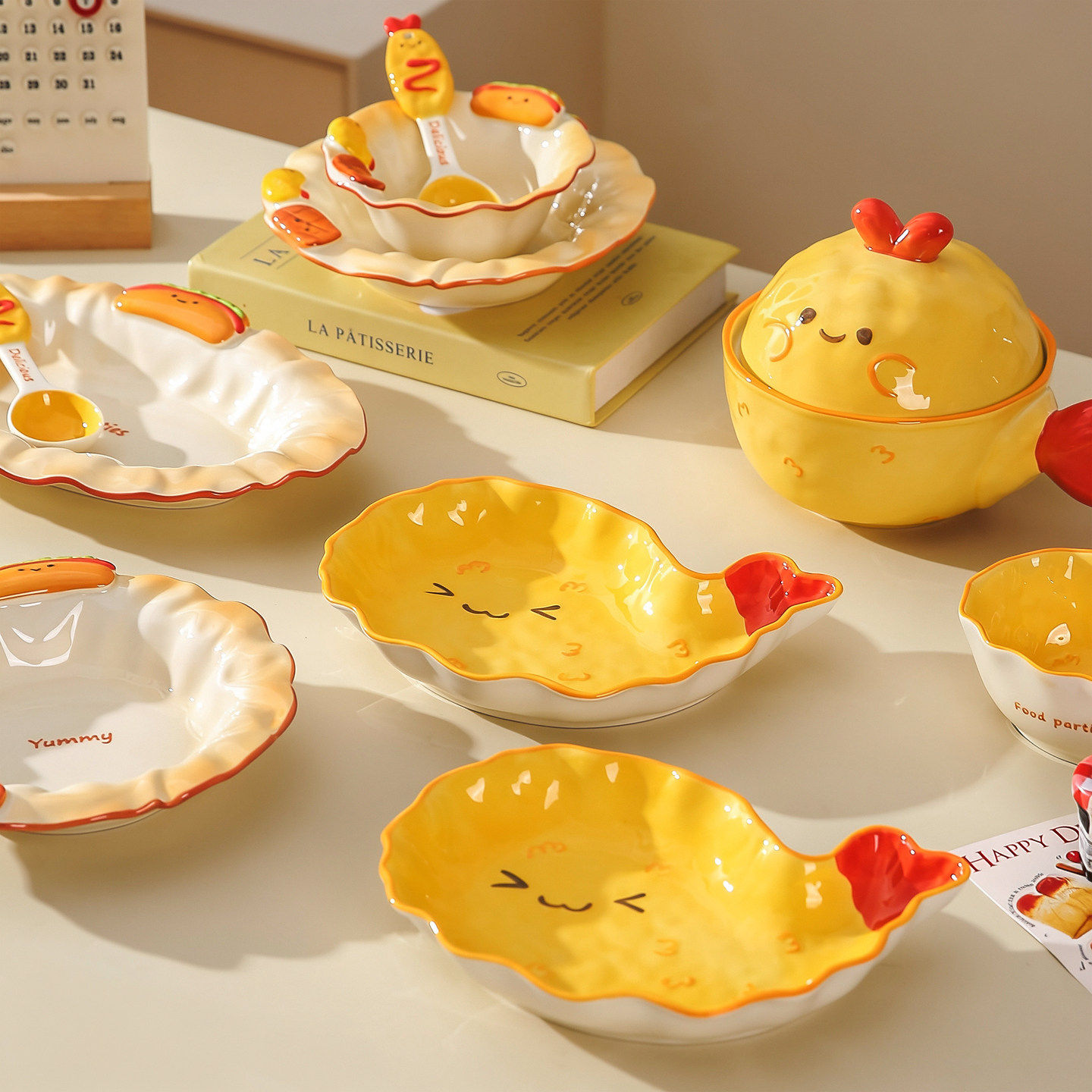 奶油风陶瓷碗家用卡通菜盘子可爱米饭碗汤碗釉下彩儿童餐具耐高温