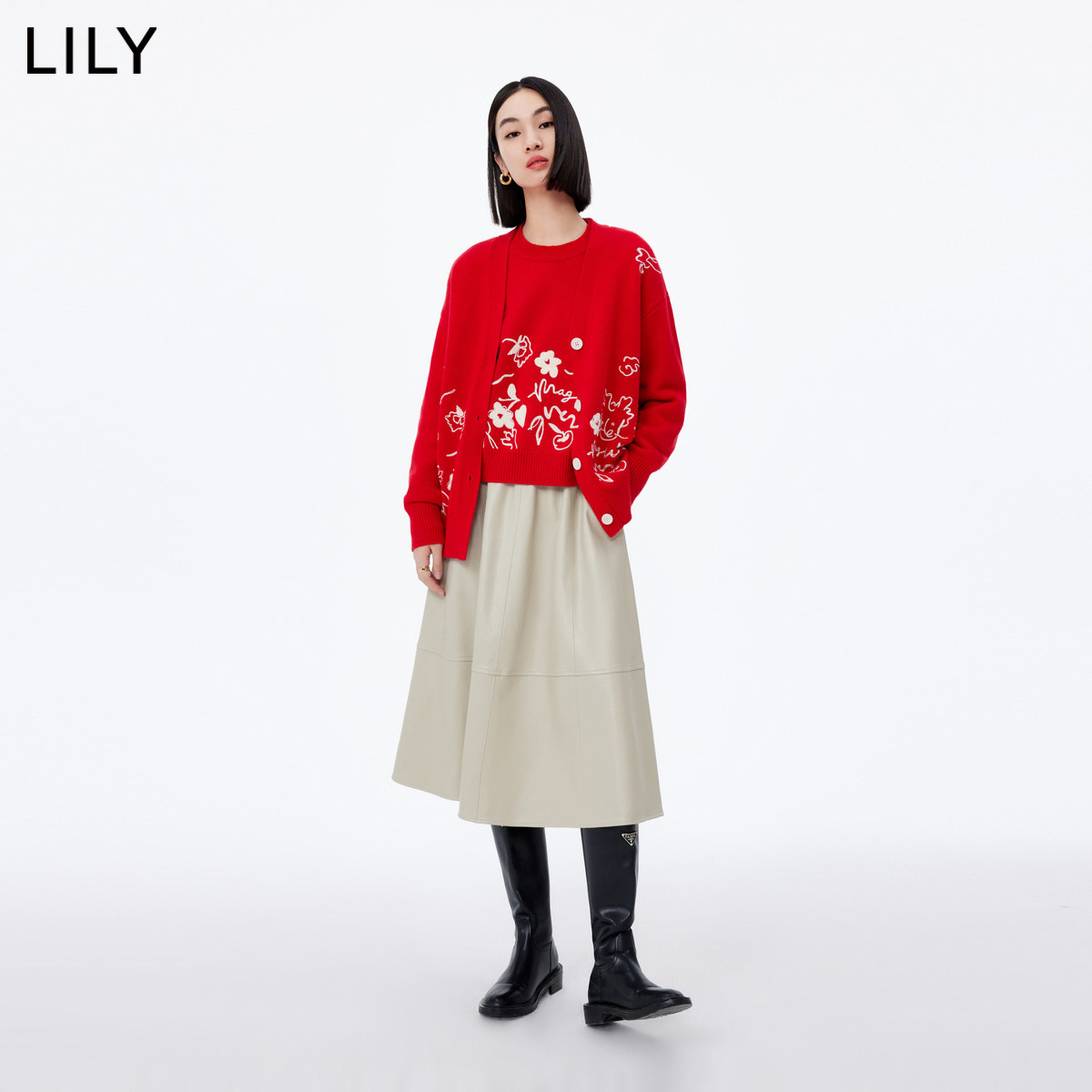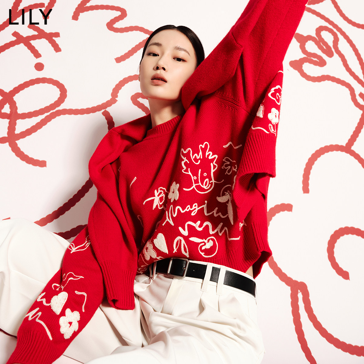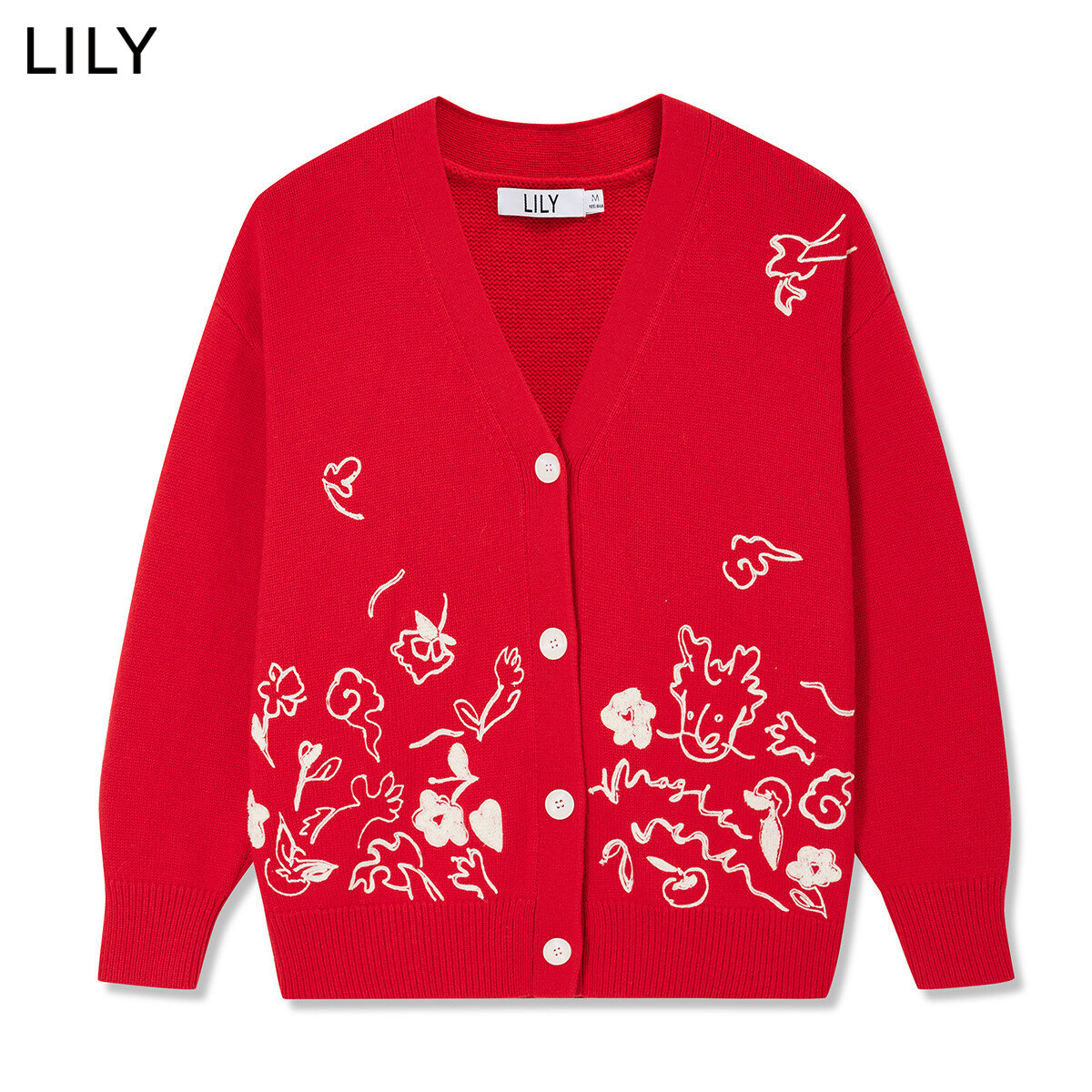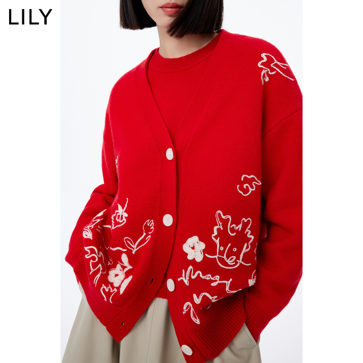 LILY新款女装绵羊毛趣味复古款红色针织开衫外套v领毛衣女