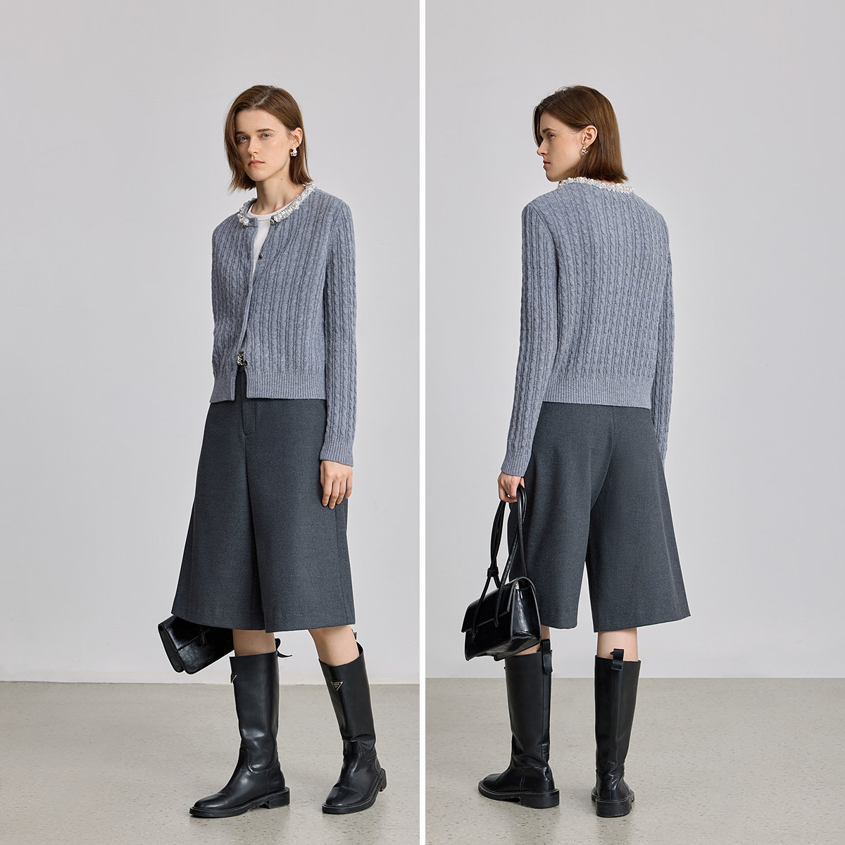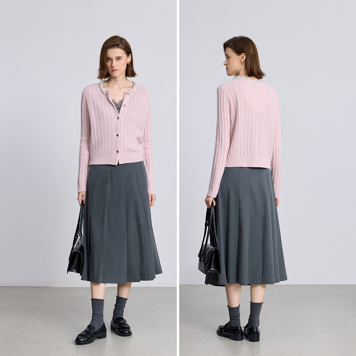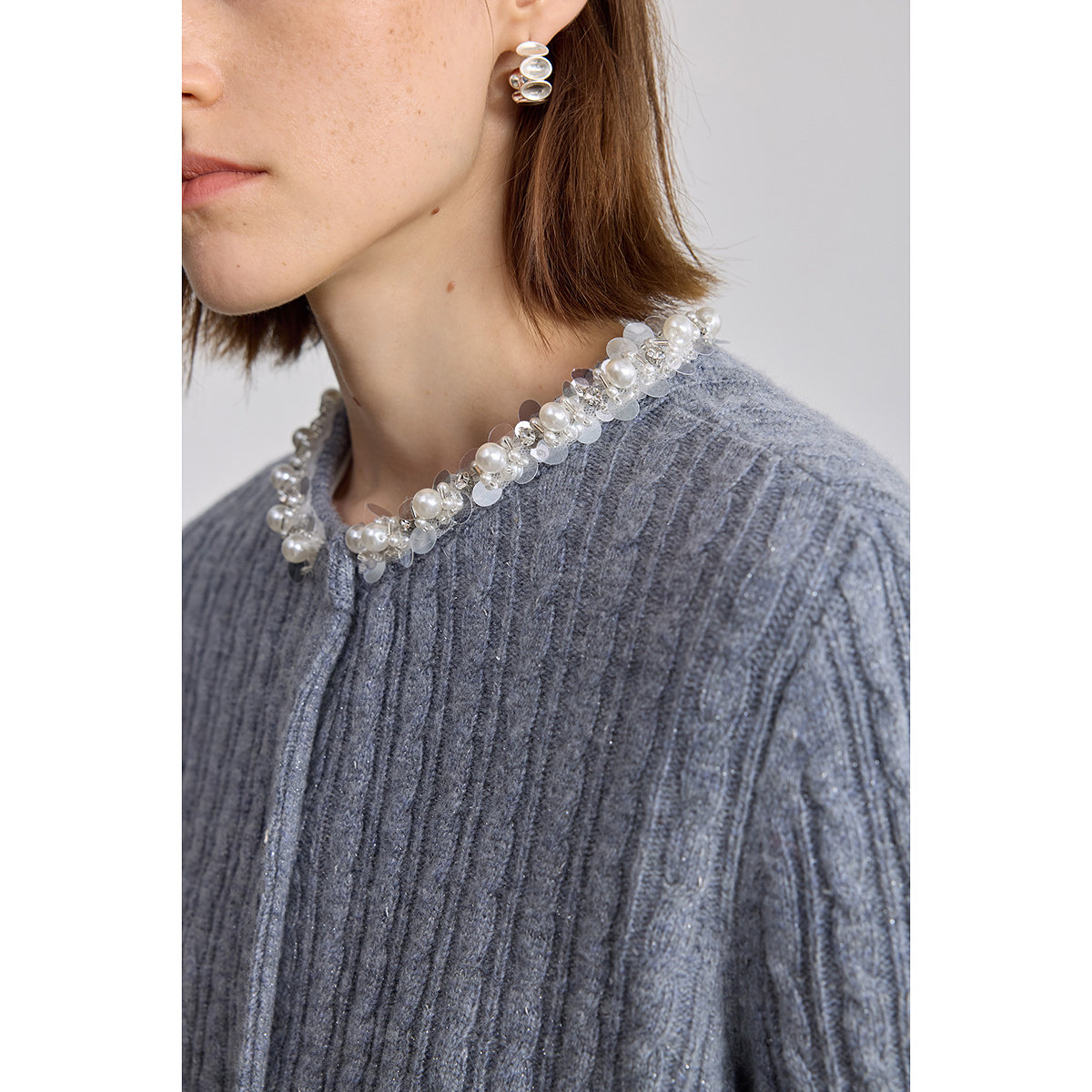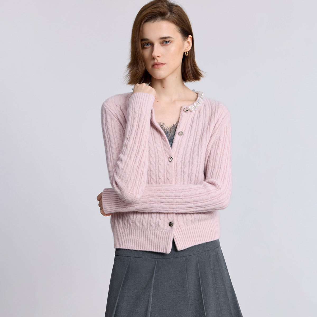 LILY2025冬新款羊毛混纺精致珍珠亮片圆领绞花气质通勤针织开衫女