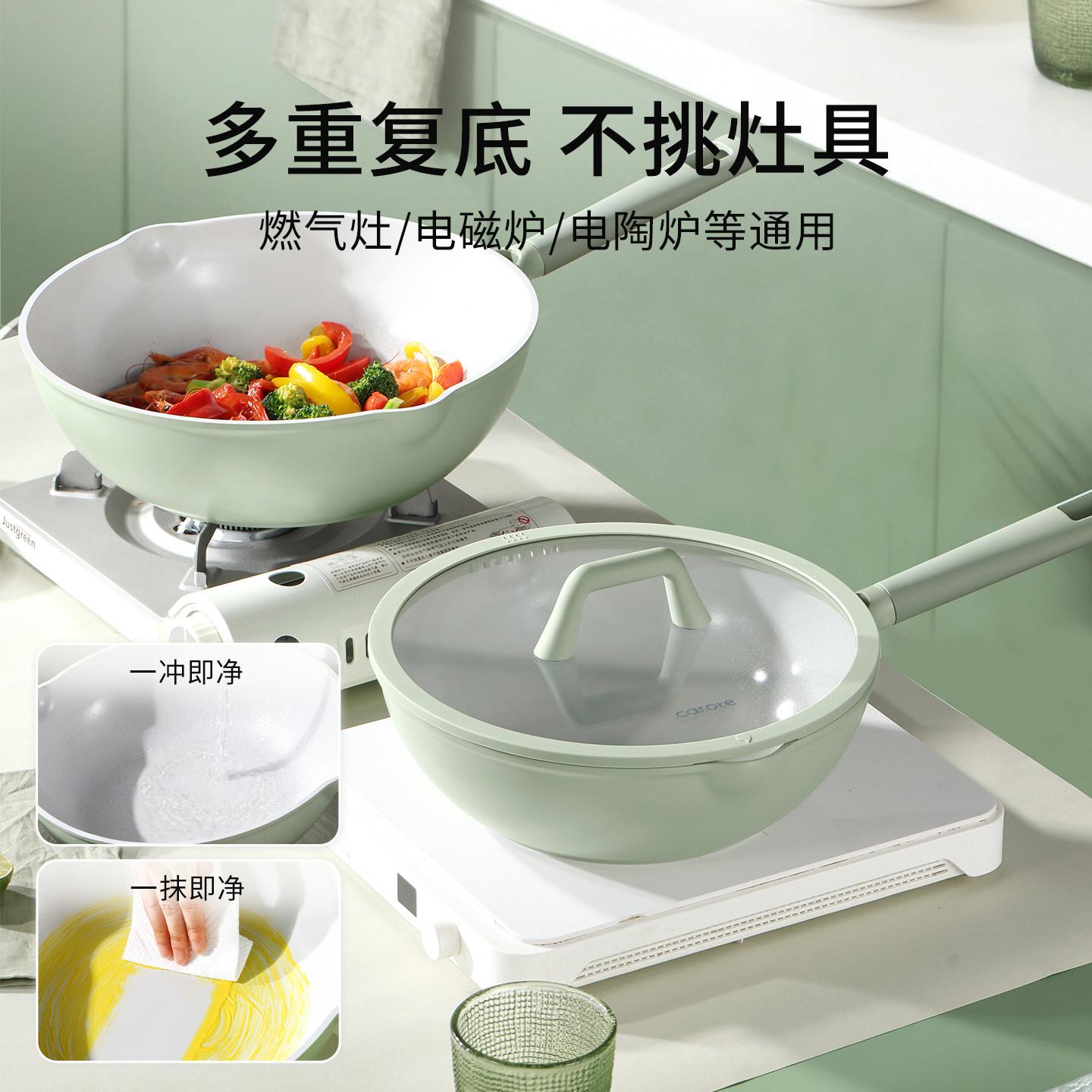卡罗特不粘锅炒锅家用钛陶瓷炒菜锅燃气灶电磁炉专用锅平底锅煎锅