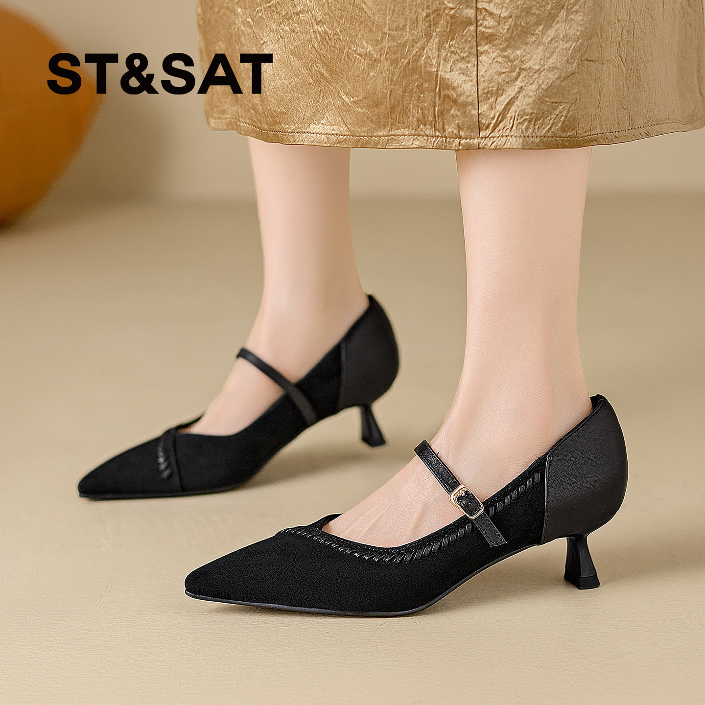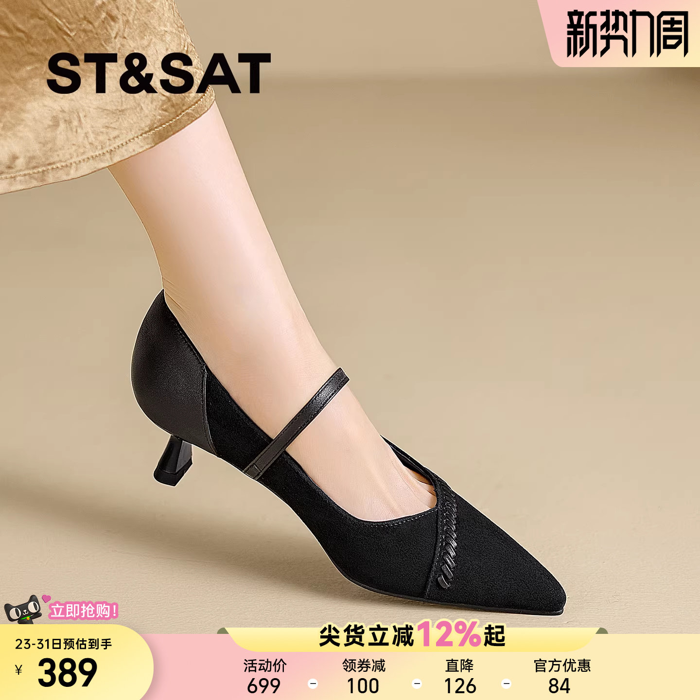 星期六2026新款巨好看气质尖头玛丽珍高跟鞋女一字扣带小猫跟单鞋
