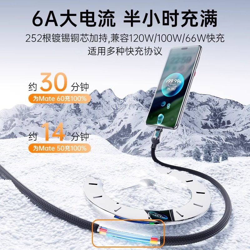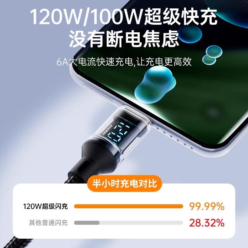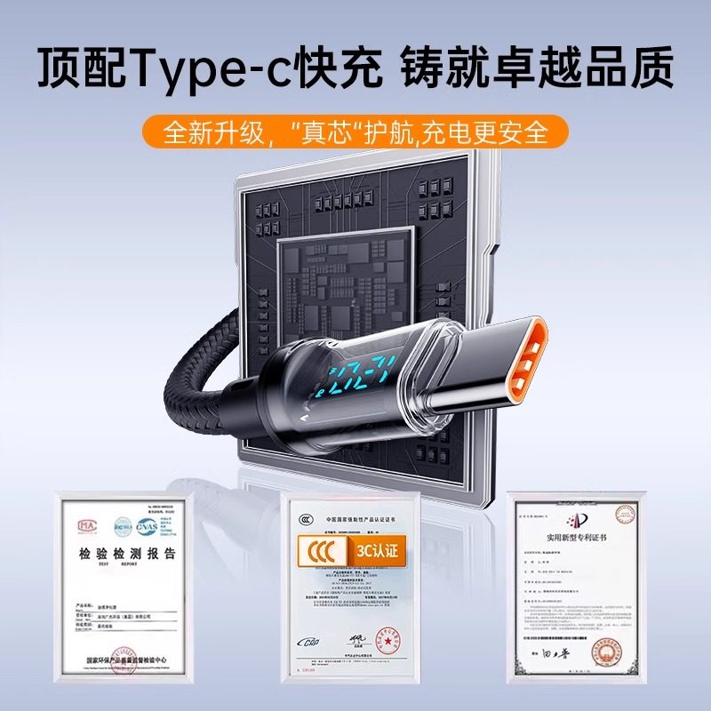 Type-c数据线120W超级快充适用华为oppo小米vivo安卓手机闪充100W充电器线车载6A数显编织通用智能断电正品