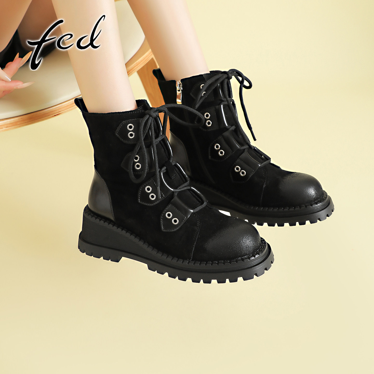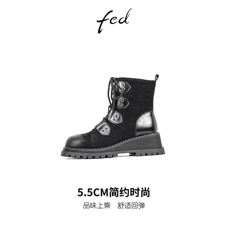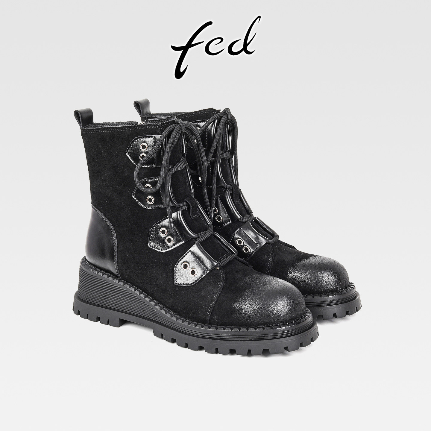 fed复古擦色牛反绒坡跟厚底马丁靴女秋冬新款侧拉链圆头高跟短靴