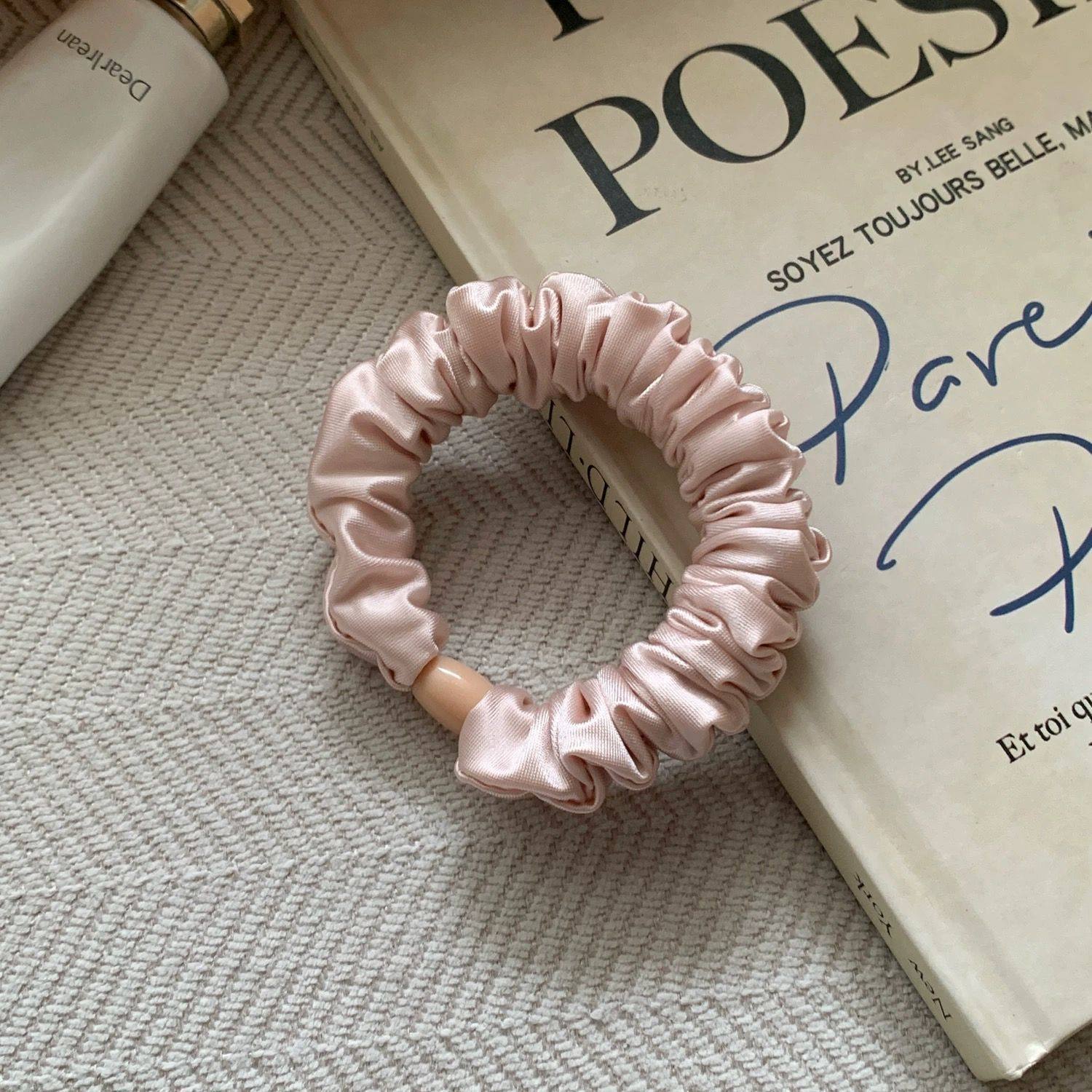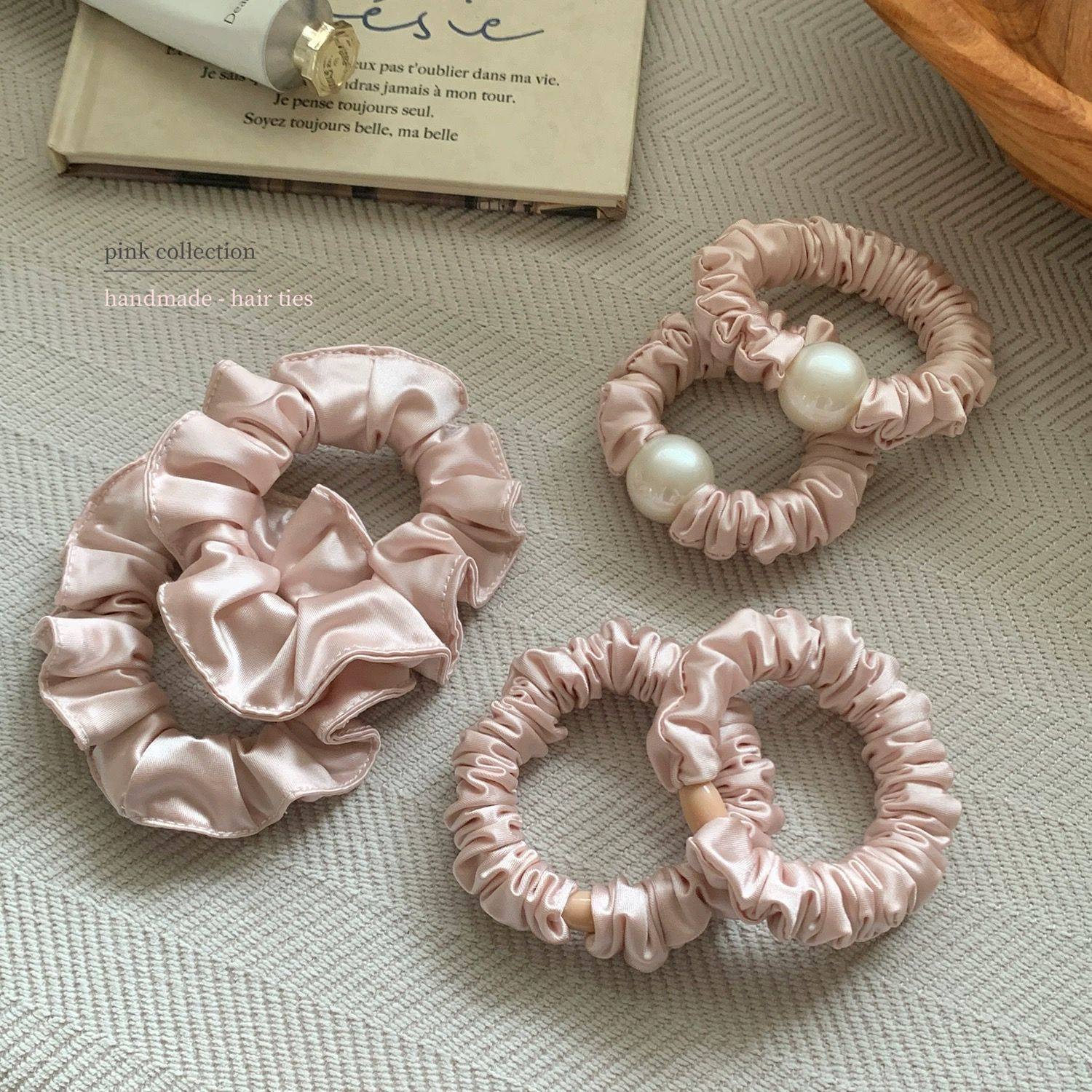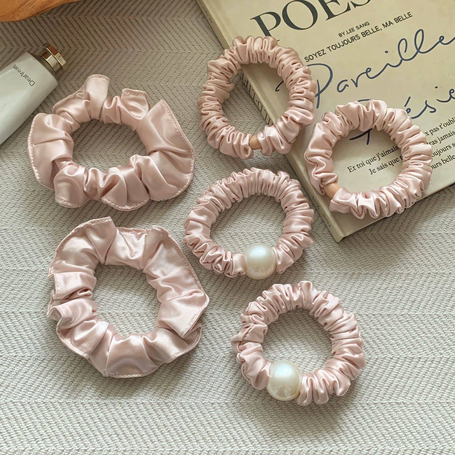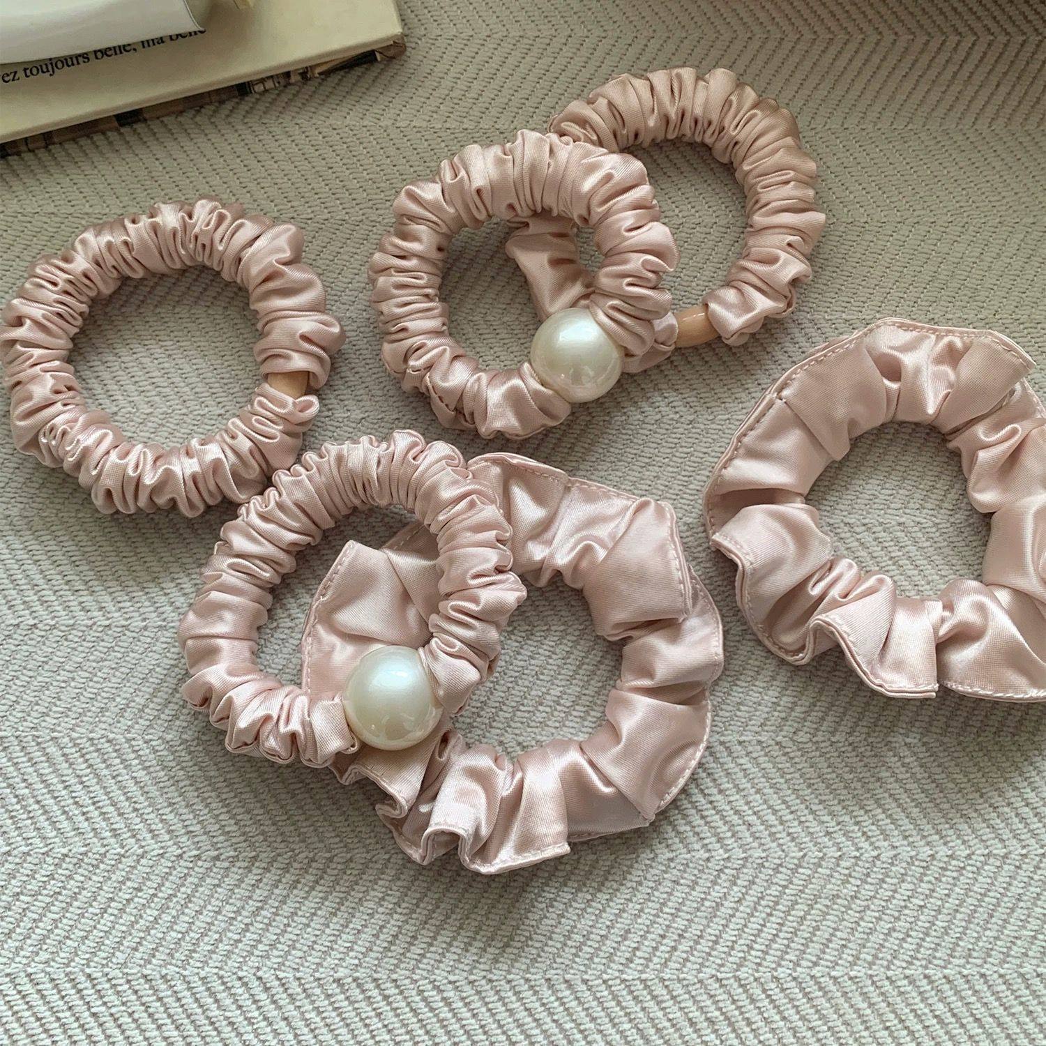 甜美粉色缎面褶皱珍珠小肠发圈女2025新款高端扎头发皮筋发绳头绳