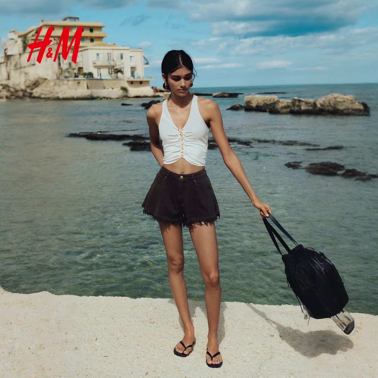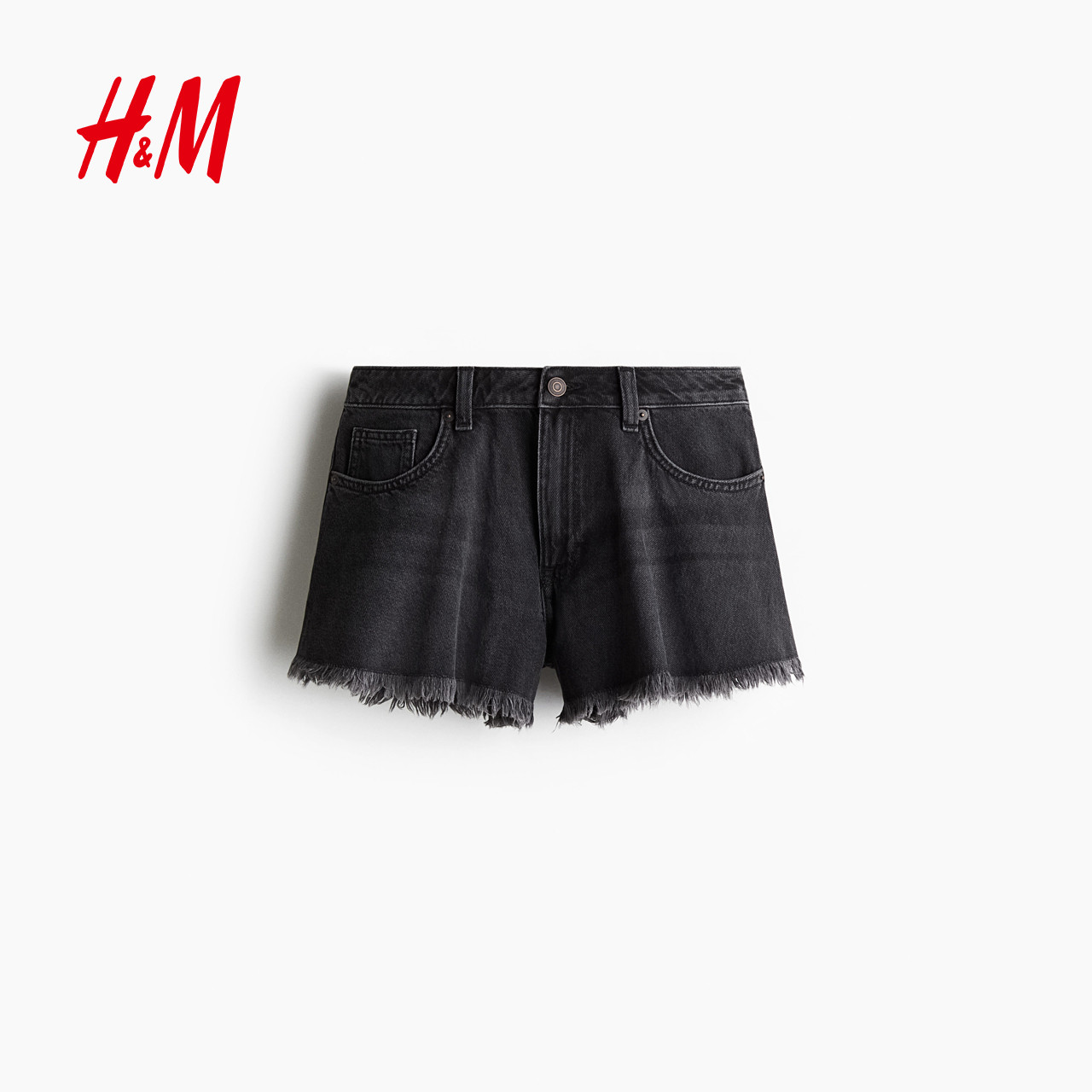 HM女装牛仔裤春季高腰宽松通勤度假毛边牛仔短裤1266902