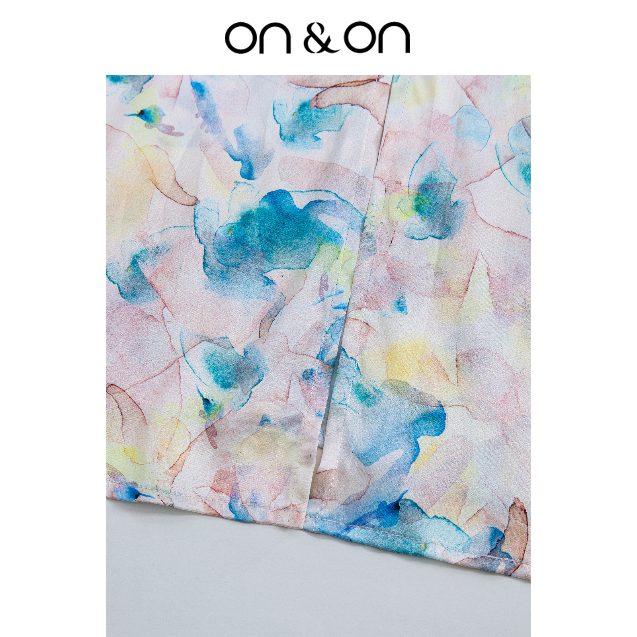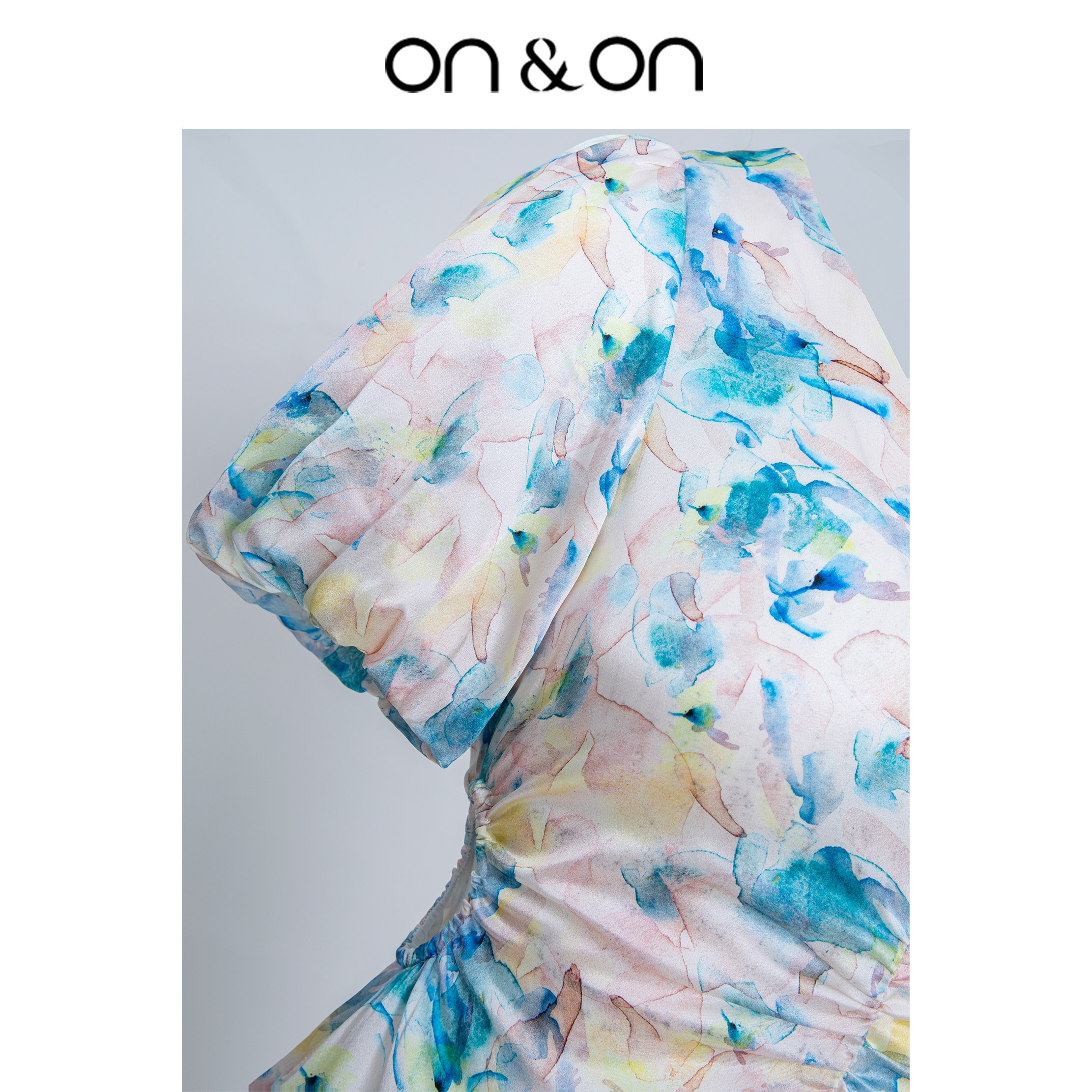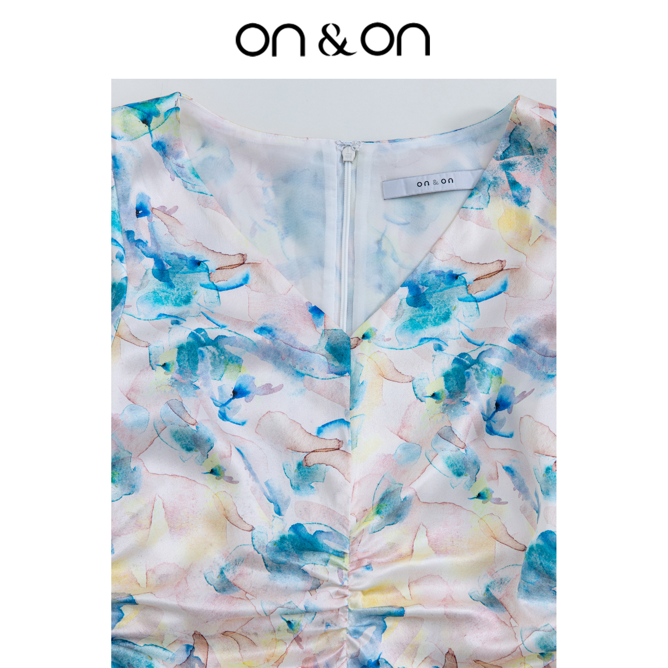 ON&ON/安乃安夏季新款V领褶皱收腰女真丝印花舒适感连衣裙优雅