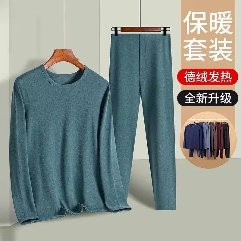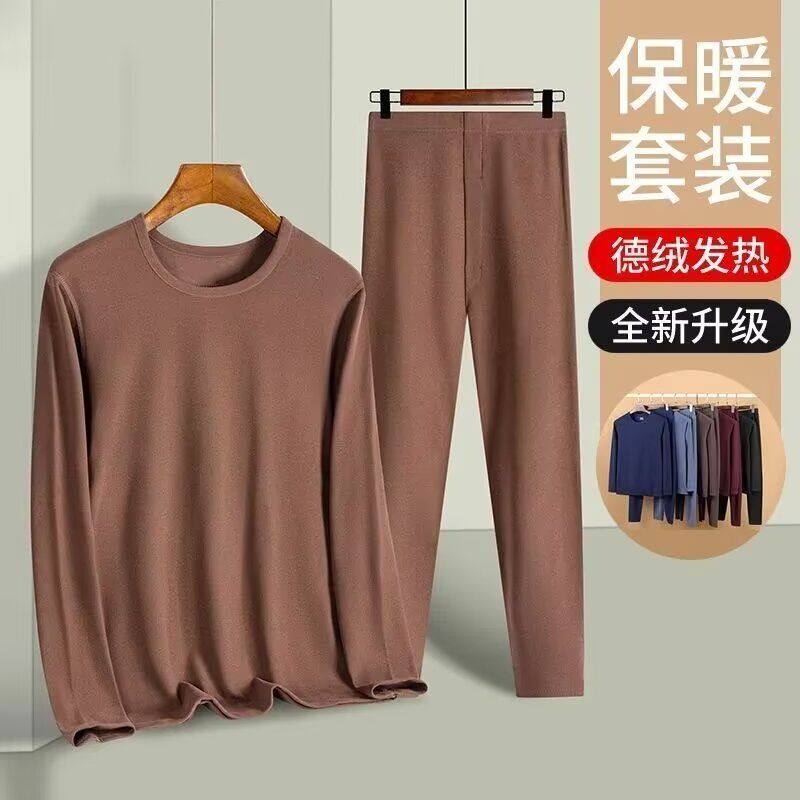 弹力德绒发热保暖套装男青年圆领长袖打底衫秋衣秋裤大码内搭双面