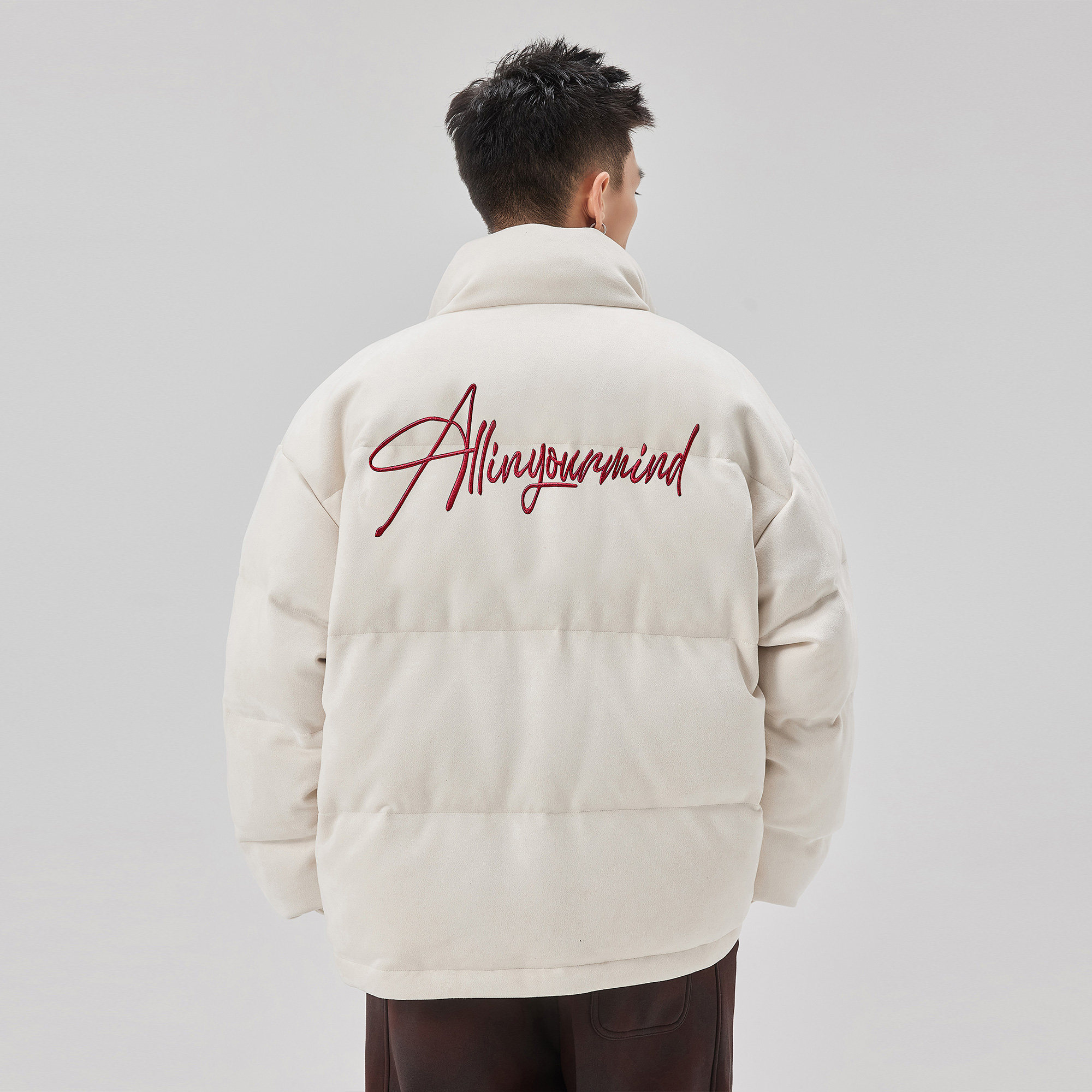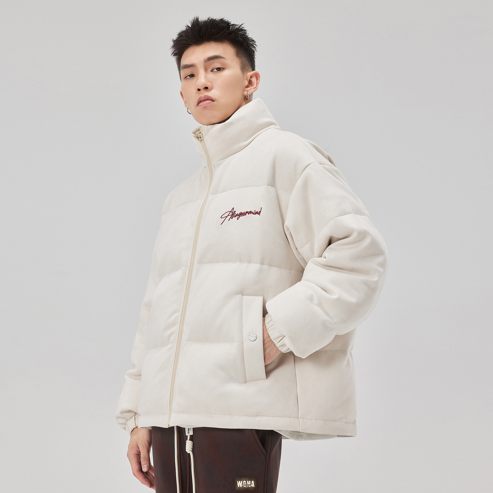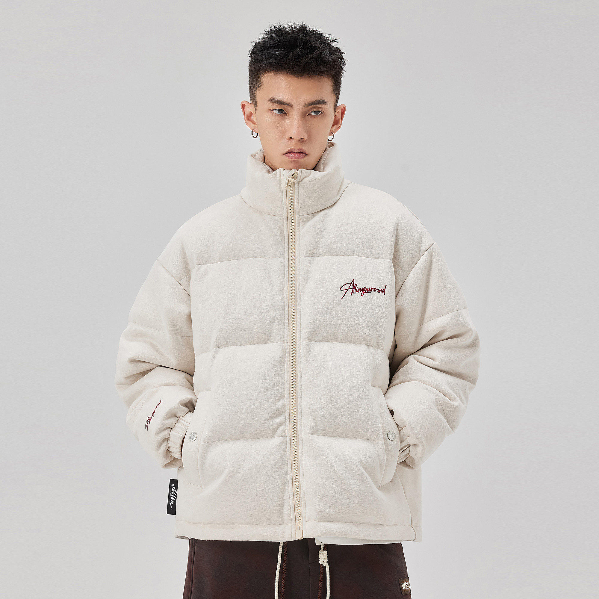ALLIN 白色潮牌羽绒服男款冬季短款立领加厚保暖字母刺绣情侣外套