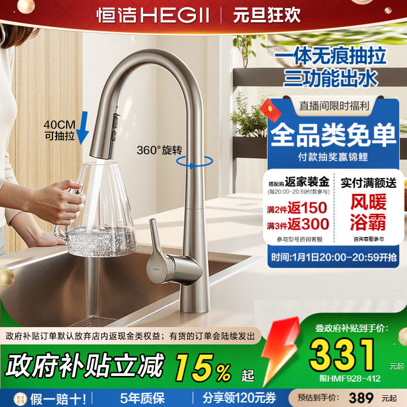 恒洁卫浴官方厨房水龙头抽拉式冷热万向旋转洗菜盆水槽防溅家用