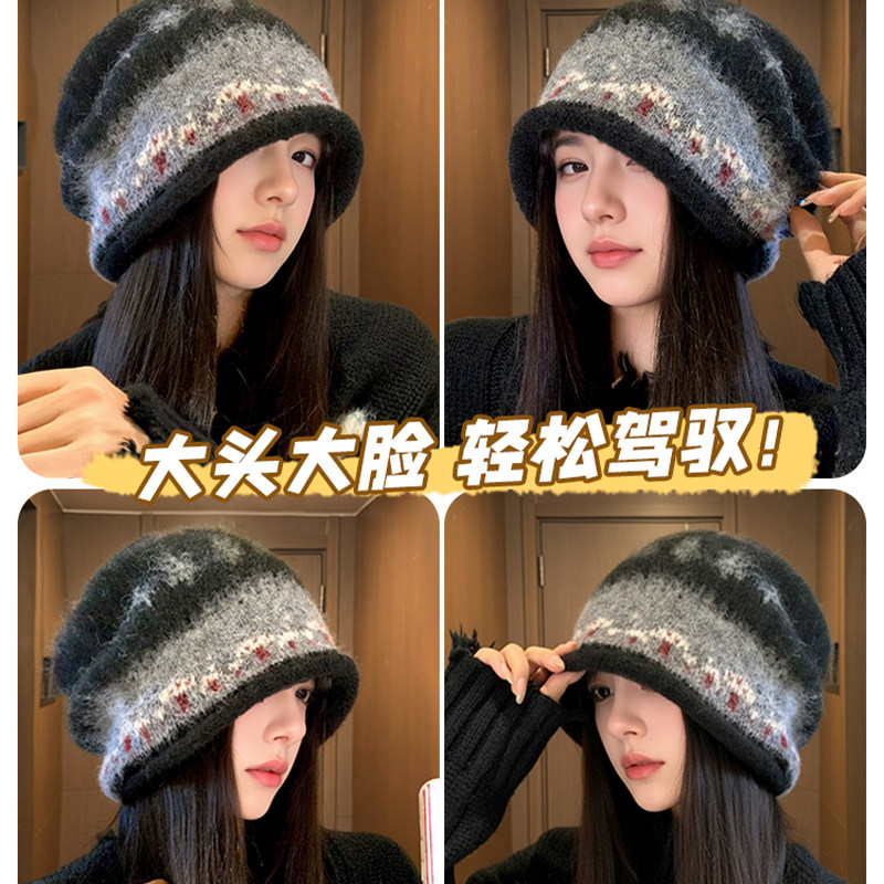 费尔岛帽子女2026新款秋冬复古冷帽大头围慵懒风防寒保暖堆堆帽