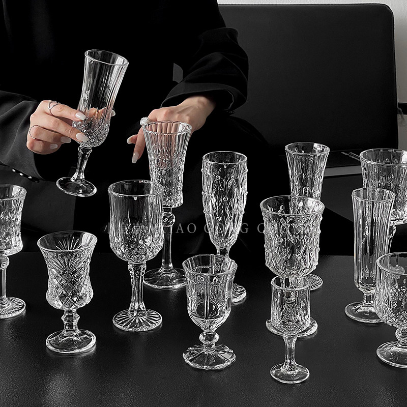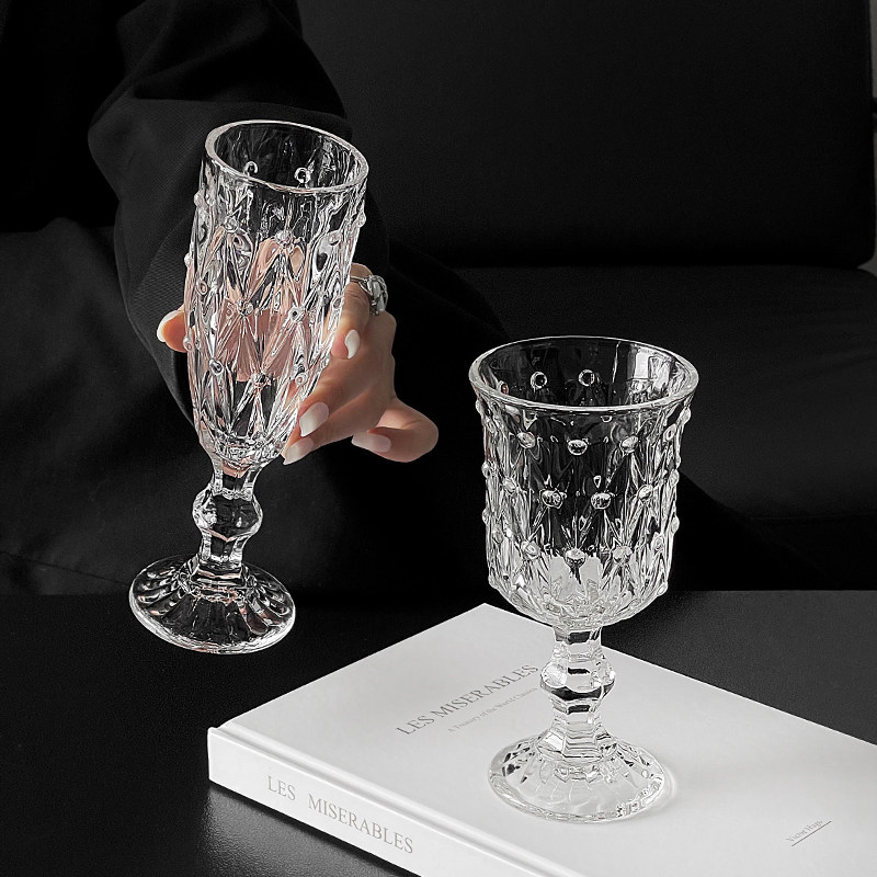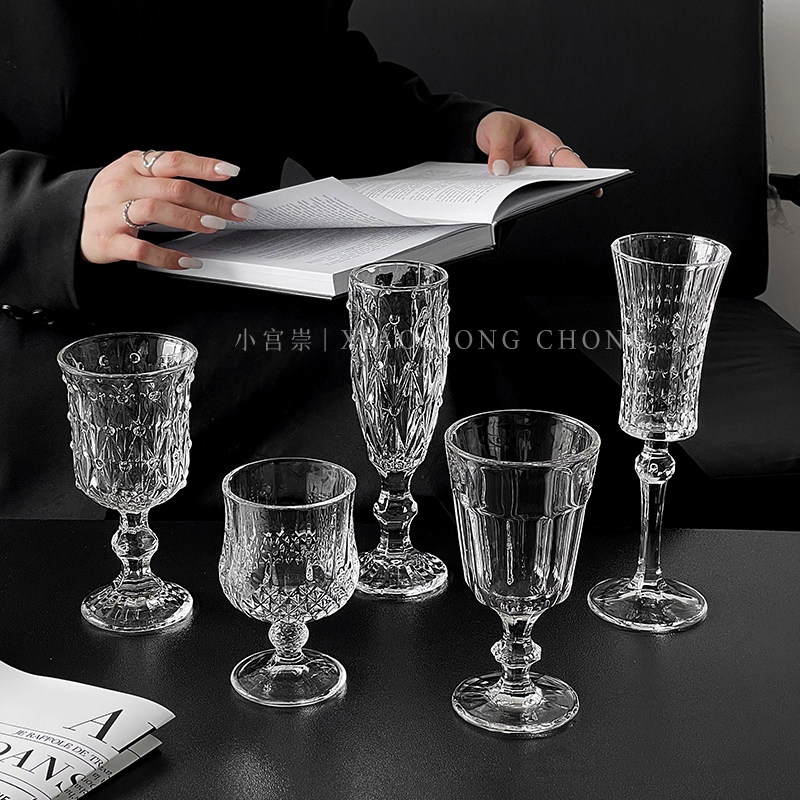 ins风复古浮雕刻花钻石玻璃香槟杯红酒杯高颜值家用高脚杯洋酒杯