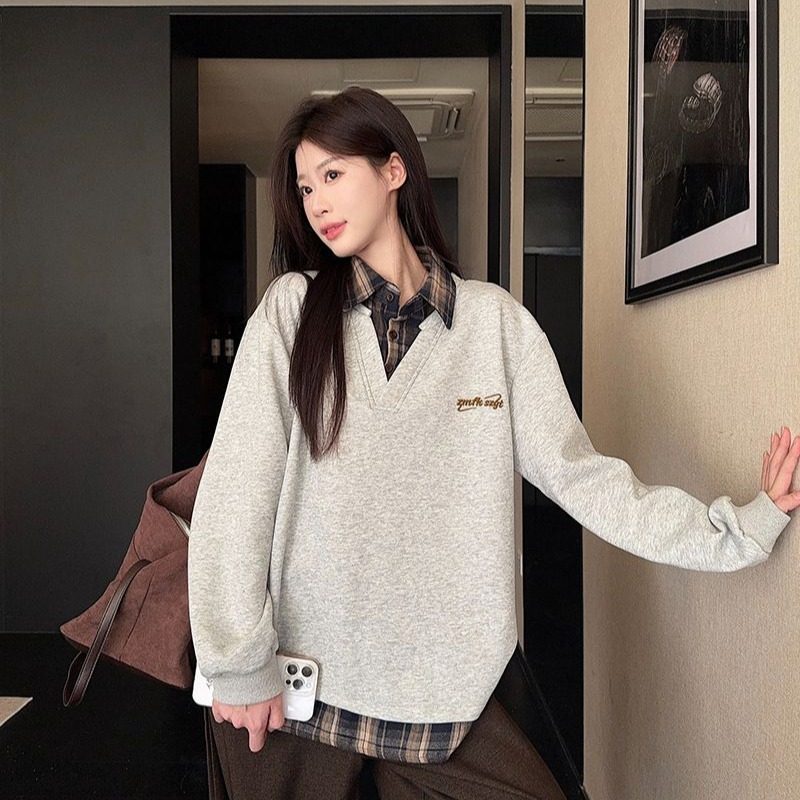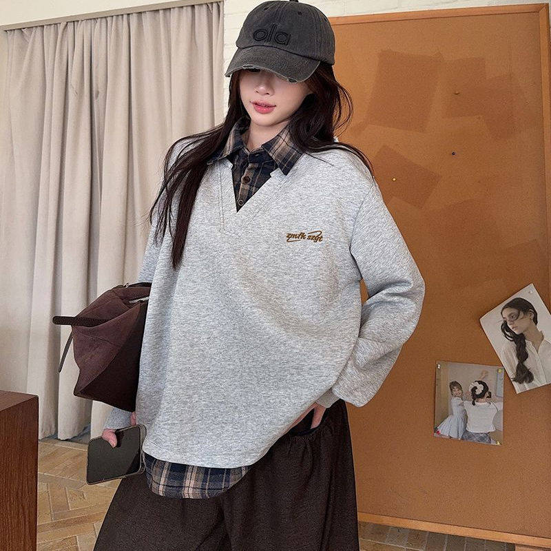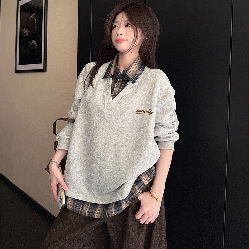 婧麒孕妇韩系休闲假两件格子拼接卫衣长袖POLO领宽松百搭上衣