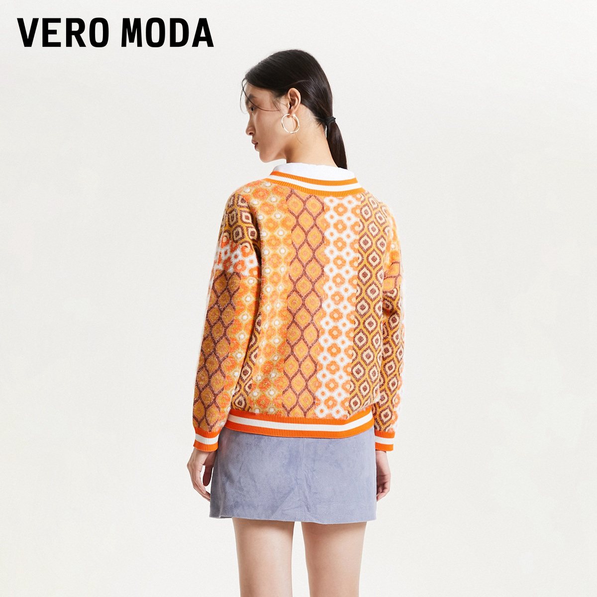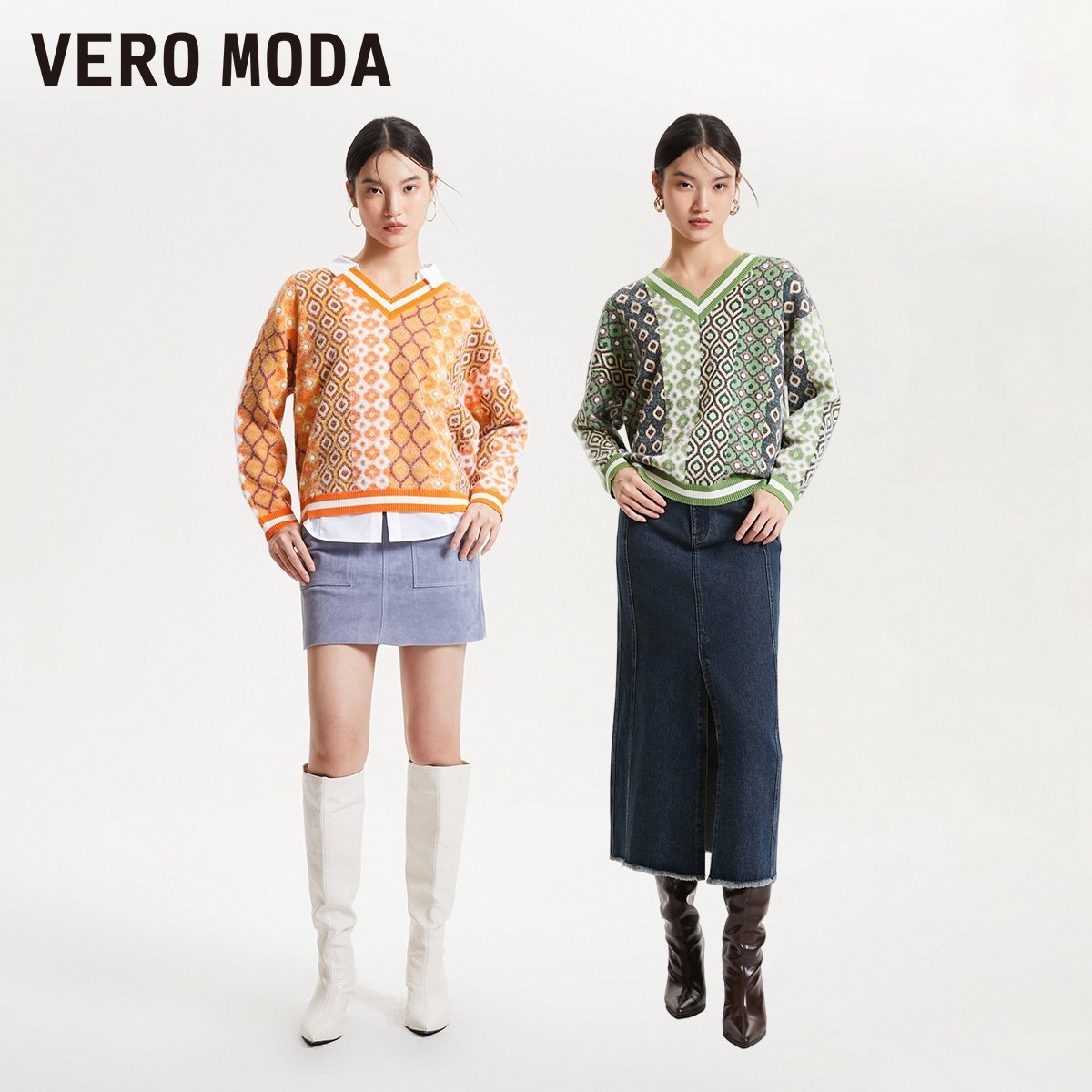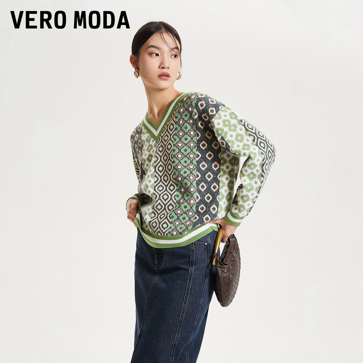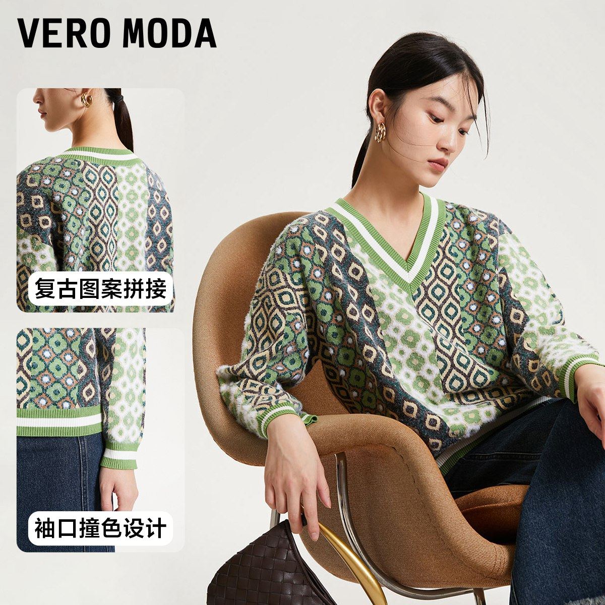 Vero Moda奥莱针织衫女秋冬清仓V领复古印花时髦宽松休闲毛衣流行
