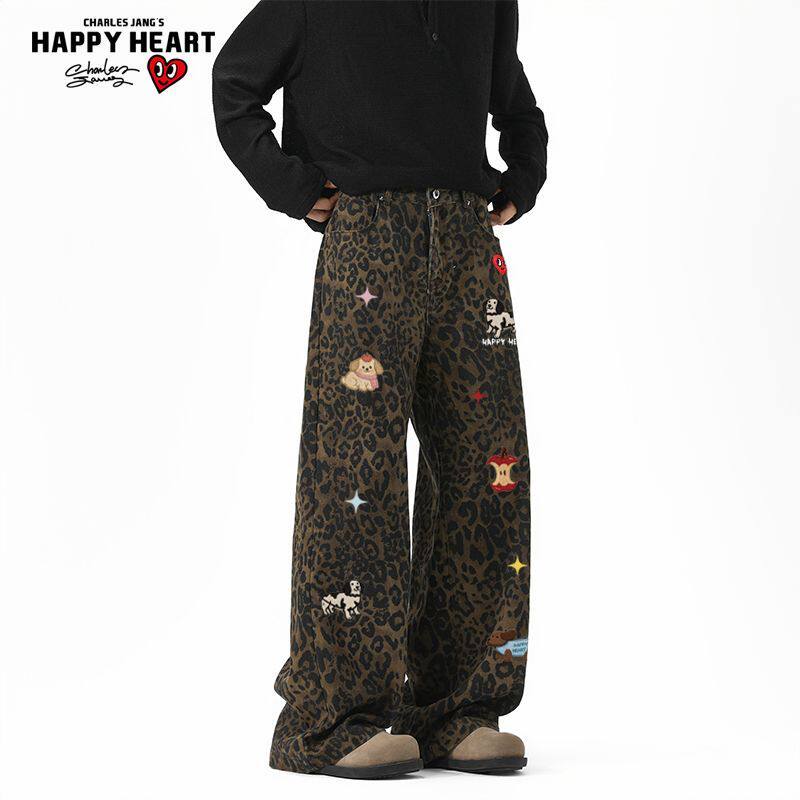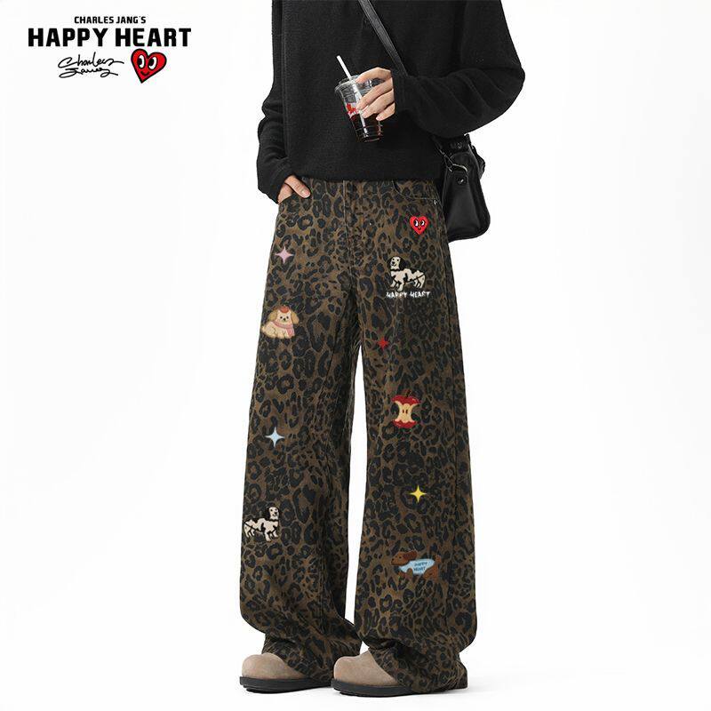 查尔斯桃心趣味小狗豹纹牛仔裤男女春秋季百搭直筒潮牌休闲长裤子
