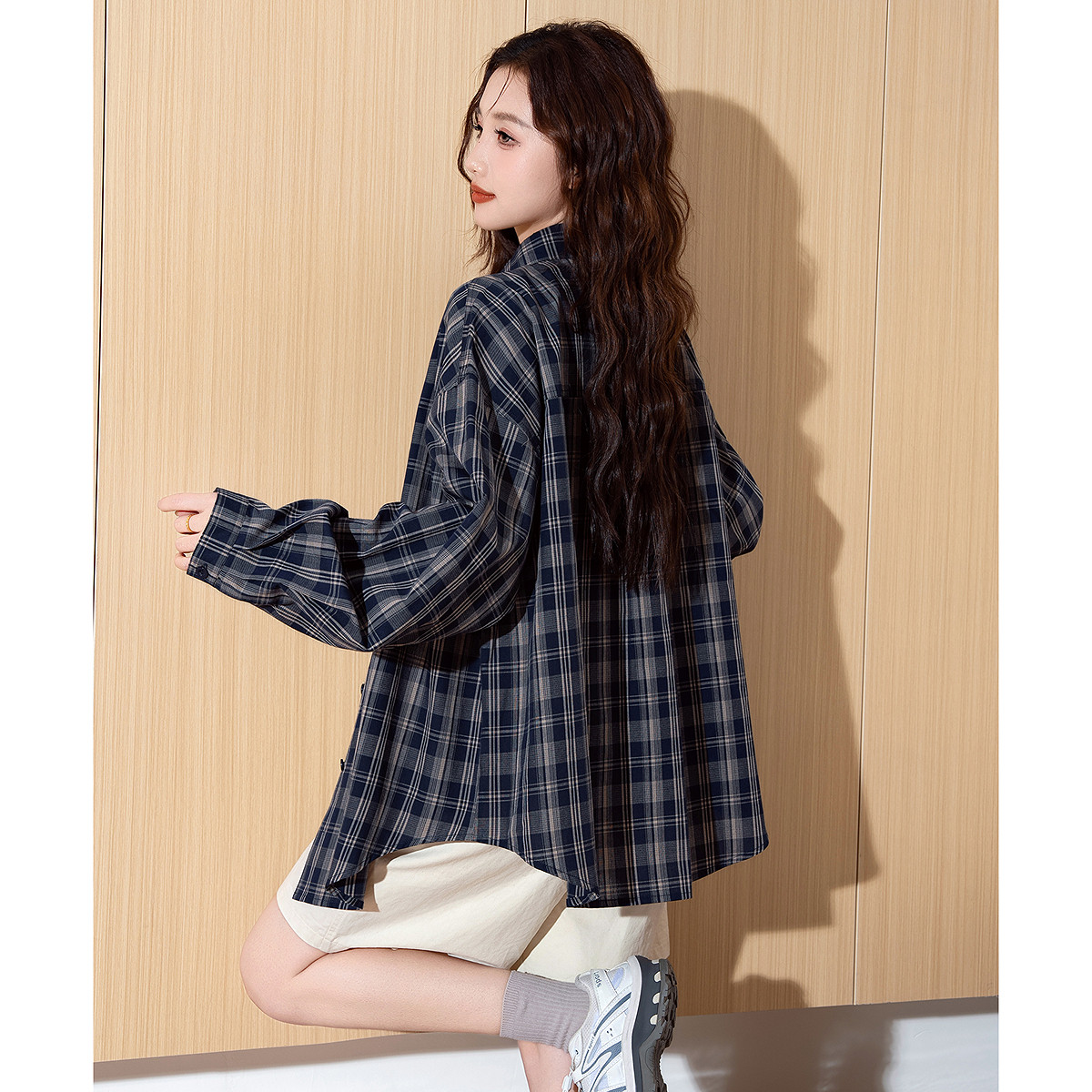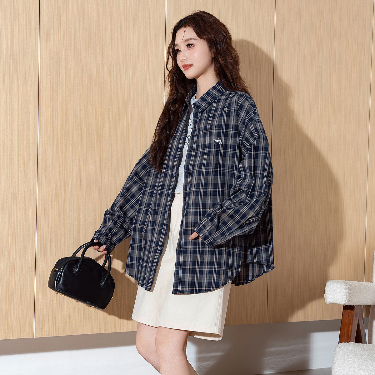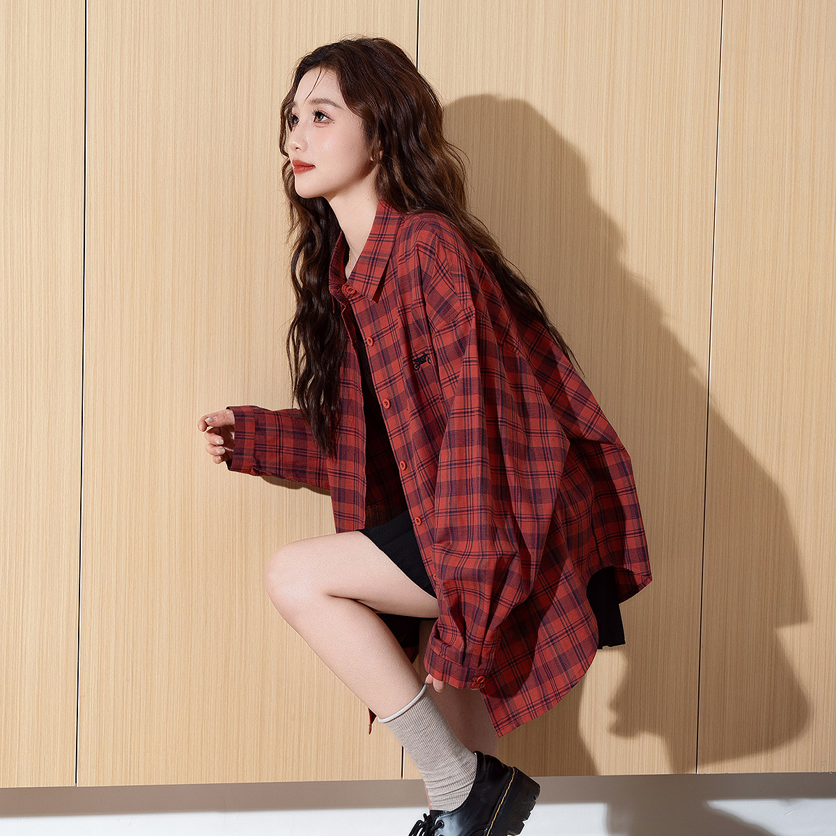 唐狮春季新款女衬衫长袖格子百搭宽松中长款流行小个子衬衣TM