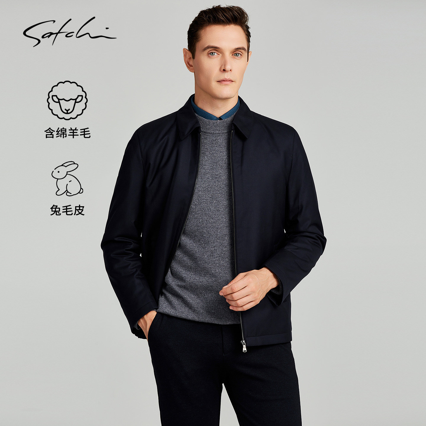 SATCHI沙驰男装男士羊毛行政夹克春季新款商务兔毛皮草干部外套厚