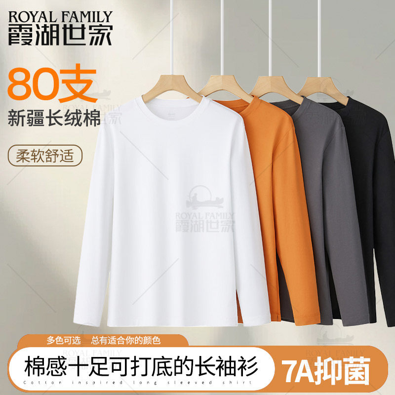 霞湖世家80支长袖T恤男女长绒棉7A抑菌纯色打底衫棉白T三代179A