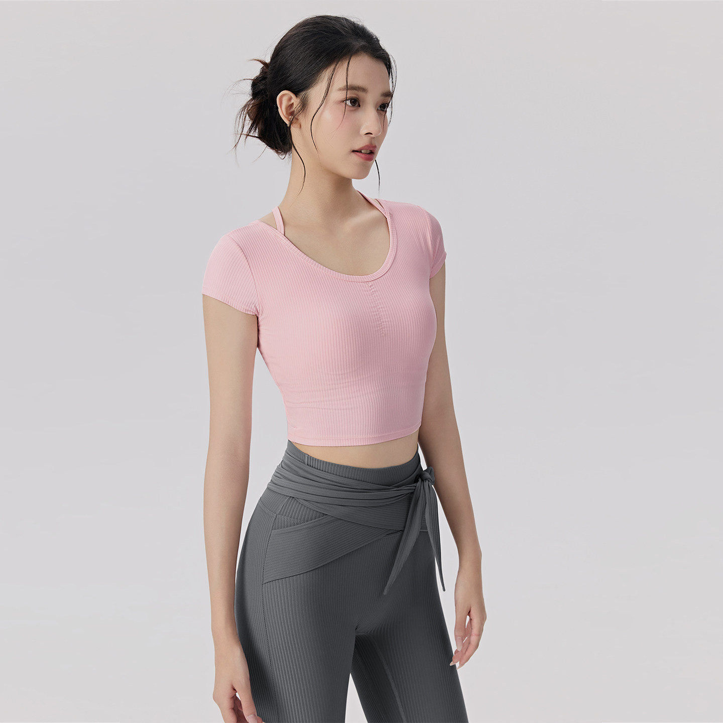 佑美镂空带胸垫短款修身瑜伽服女短袖运动性感普拉提训练健身上衣
