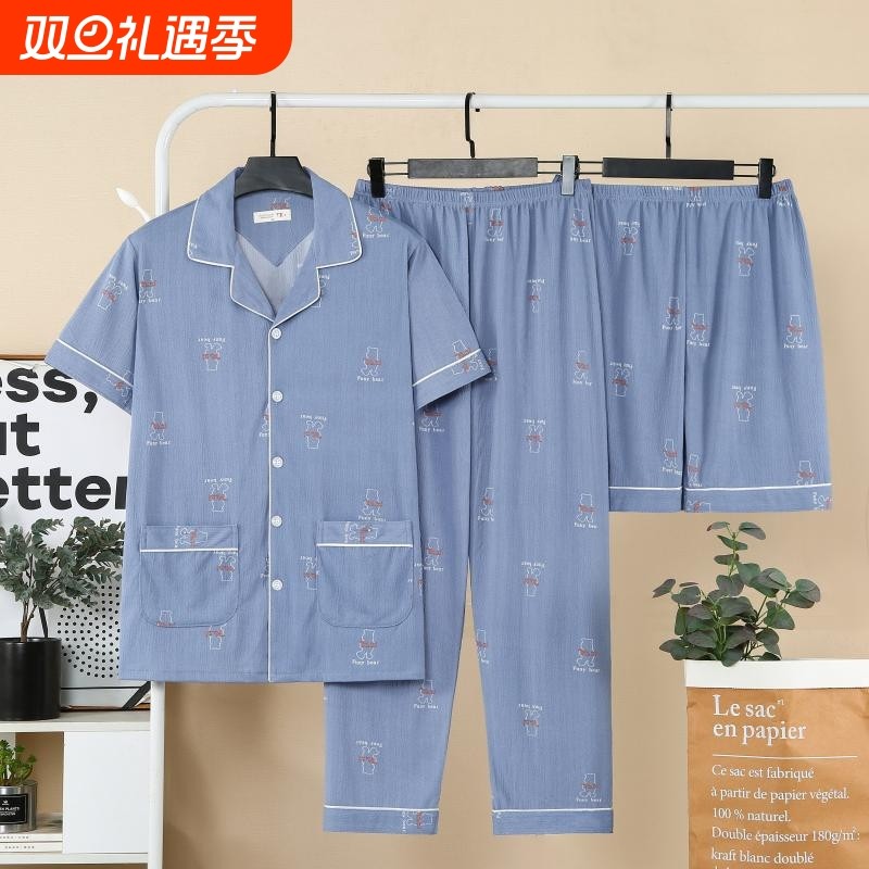 睡衣男士夏季三件套薄款短裤长裤春夏天短袖外穿大码家居服衬衫